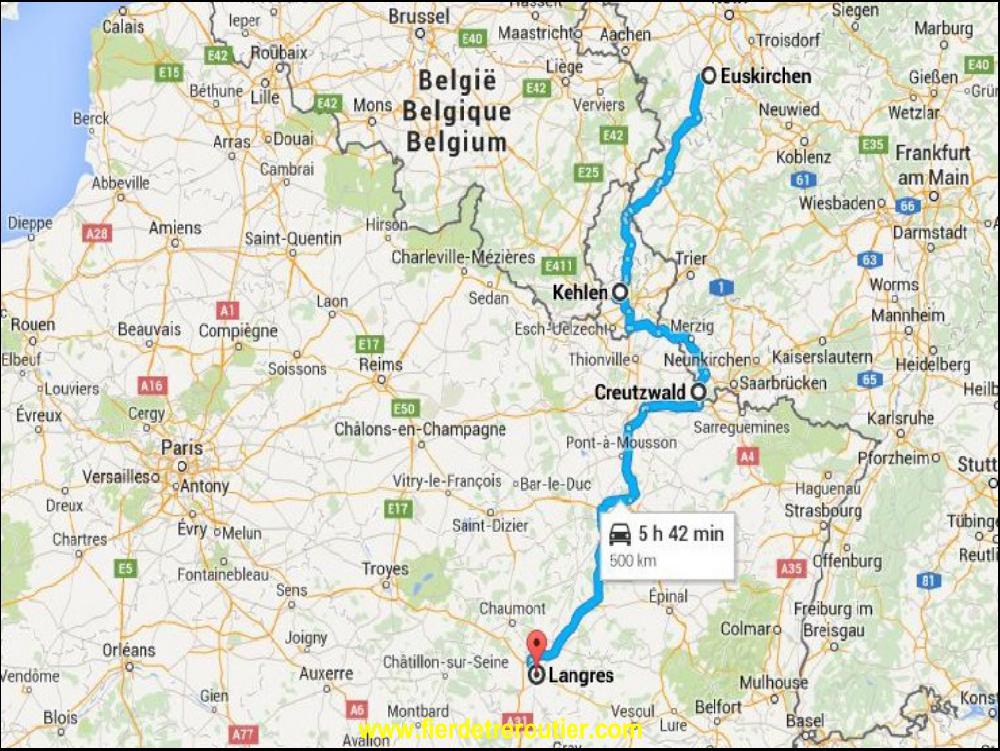 J'ai tout calculé dans tous les sens, je pourrais jamais rejoindre les bras de ma dulcinée ce soir. Donc, hors de question que je me prenne la courge, je demarre tranquillos à 6h avec 11h de coupure, tranquille. Premier arrêt à Olzheim pour prendre les 2 pauvres tickets MAUT pour terminer le trajet jusqu'à la frontière. J'ai hésité à aller prendre le petit dej chez l'enorme Berta, mais elle me fait peur, alors je suis parti me mettre sur la B51, ce matin, y a un troupeau de grumeaux, ça roule à 60, pas 61, non, plutôt même 59 que 60. Autant dire que j'ai perdu 10 ans d'esperance de vie derrière mon volant, vu qu'en plus c'est interdit de doubler de partout... Heureusement après une fois au luxembourg, y avait des bouchons, ça m'a changé un peu. Avec Anthony, le Suédois chauve, on se pose quand même la question si on serait pas gagnants de passer par la Belgique pour rejoindre Kehlen. Je finis par me radiner avec 2h45 de route depuis Euskirshen, on est en 2015, on met autant de temps qu'il y a 40 ans avec les Magirus ! Pendant que l'équipe vide la semi, j'en profite pour me faire couler un bain à base d'huiles essentielles 15w40.