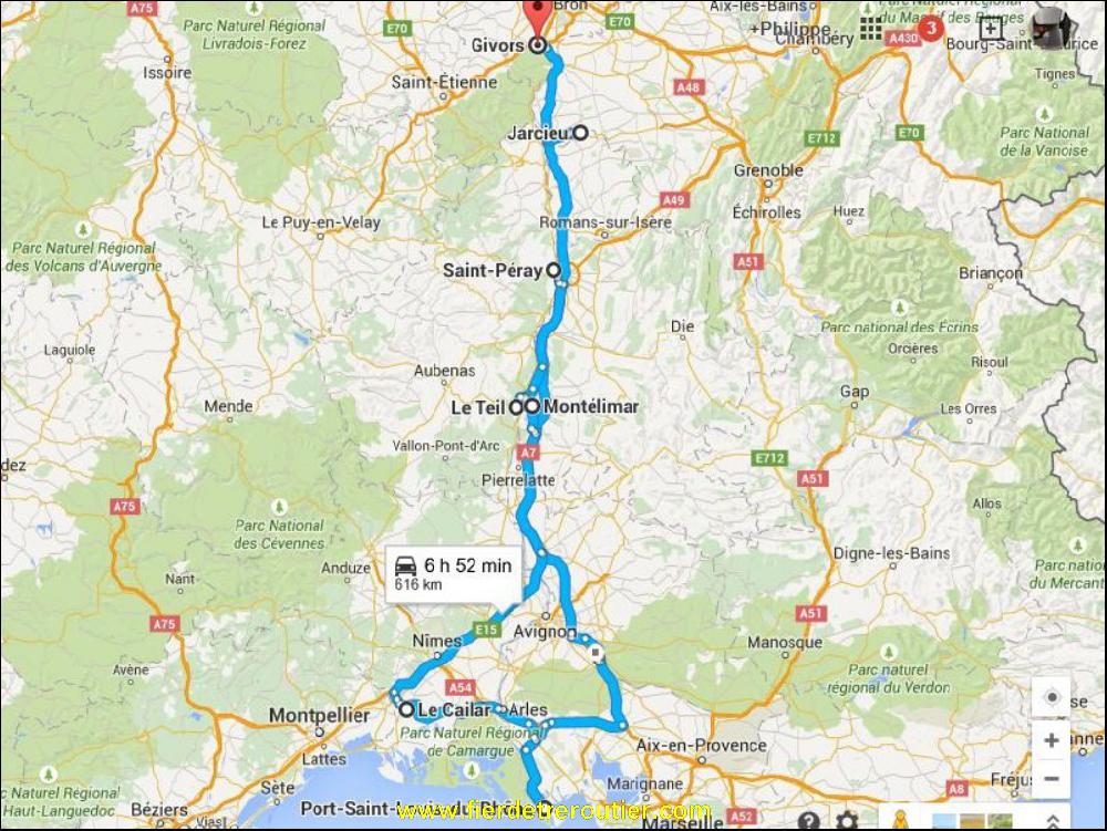 J'ai une ramasse exotique à suivre à Le Cailar, je me voyais déjà manger une bonne salade au Roquefort, mais en fait trop pas, c'est Le Cailar dans le 30, dans le pays des moustiques, en Camargue. La route est pas tip top, mais c'est l'occasion de la decouvrir vu que c'est l'itinéraire BIS pour Montpellier mais interdit au +12T. Arrivé chez le client, j'ai pas osé descendre du camion 2 enormes molosses m'acompagnent, j'ai téléphoné au client qui est venu tenir ses chiens, et m'a dit que j'avais bien fait, ils jouent et bouffent les pantalons ! Bon, moi je suis pas trop joueur alors !!! Heureusement les 6 palettes de plantes aquatiques sont prêtes et je pars vite avant que la route soit barrée à cause d'un chantier, ils refont les lignes PTT dans le coin. Je dois remonter faire deux autres ramasses sur Montelimar et Le teil dans le 07 non sans avoir cassé une croute à Nimes ou il fait une chaleur lourde torride et déjà pénible avec le vent du sud, c'est le phénomène El Nino qu'ils ont dit à la radio !!!