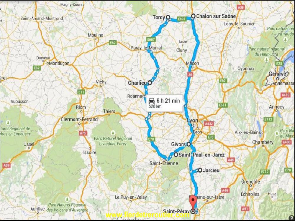 Quand je demarre à 7h00 ce matin, l'A47 est déjà un vast parking direction Lyon, le bouchon remonte ce matin pratiquement jusqu'à Dussurgey, oui, ça fait 8km. Faut être vraiment fou pour supporter ça tous les matins. De mon côté, ça roule ma poule et je vais prestement faire ma première livraison de pommes à St Paul en Jarez, c'est trés joli comme coin... Livraison sans soucis, j'ai plus qu'aller affronter les bouchons du matin à St Etienne, mais ça passe plutôt bien. Il ne me reste alors plus qu'à gambader dans la campagne de la Loire accompagné par ce sale vente de sud et toujours pas de soleil. Je vais livrer à Charlieu dans une vielle usine de tissage, superbe et bordelique sans protocole sans rien, les palettes que je livre sont instables et pourries, mais le cariste en a vu d'autres et ne fait pas d'histoires. Quelques kilomètres plus loin je passe la frontière de la région Rhone Alpes pour me retrouver sur les terres sauvages de la Bourgogne. C'est à Torcy que je fais ma dernière livraison, juste avant midi à Torcy, impec !
