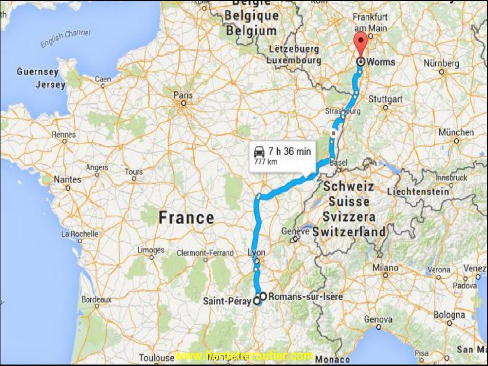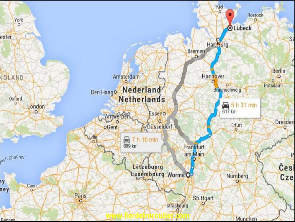 C'est déjà midi quand je sors de Romans, et le chef du terminal en Suède me demande de livrer vendredi avant 14h. Je me vois pas la bas avant 16h, mais le vendredi ils ferment plus tôt comme de partout dans le monde en fait. Me voilà donc contraint de forcer. Je suis pas habitué. Il em fallait en plus passer aux pneus pour retailler les avant et remettre des chaussettes arrière d'été, on vera ça plus tard, je roule, je fonce. A force de me mettre en mode calcul RSE KM, je me dis qu'en prenant le ferry à Lubeck et debarquer à 7h à Malmo, ça devrait le faire. Je soumets l'idée au chef en suede, et il walide, je susi "booké" pour le ferry de 22h, il faut arriver avant 21h au port en Allemagne. On dirait pas comme ça, mais ça m'a pris au moins 2h à gamberger comme ça !!! Pour moins me prendre la courgette, je decide de monter par l'Alsace, ça me changera de la Lorraine !