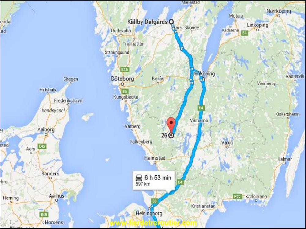 C'est bien le merdier pour sortir du bateau, et de plus, ça se voit qu'on est dans le sud, c'est un joyeux merdier à Malmö. Y a des travaux partout, associés à une circulation anarchique et l'heure de pointe du matin. On se croirait à Marseille, voilà ! Il manque juste les cigales. J'ai mis presque 1h pour rejoindre l'E4 à Helsinborg et après j'étais enfin tranquille. La météo est variée ce matin, il pleut, il y a du vent puis du soleil et du vent, puis des nuages et toujours du vent, et même de la grêle ! Enfin, quoi qu'il arrive je suis à l'abri. Je fais une petite 45 avant Jonkoping et je traine pas trop parce qu'on est vendredi et que j'ai pas envie de finir tard ! C'est avec la banane que je mets mon cligno à droite quand j'arrive chez mon client, il est 13h40. J'avais RDV à 14h, je suis CONTENT ! Sauf que la rue est barrée, il y a des travaux, je dois refaire tout le tour pour acceder au quais. Comme d'hab, j'ai beau être à l'heure il faut attendre un peu, mais je m'en fous completement.