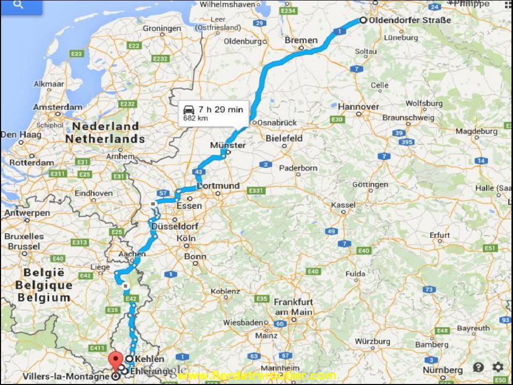 J'ai l'air detaché comme ça quand je dis que j'ai mis le reveil à 00h01, mais, il y a quand même plusieurs explications. Déjà, il faut pas abimer la quatorzaine plus que ça, en principe, en partant à minuit, on passe sur la semaine suivante. C'est vrai. En heure UTC bordel de merde !!!! Donc, les 26 minutes que j'ai roulé à partir de ce matin, comptent pour la semaine passée ! Comment ne pas terminer sa vie grincheux et dégouté ?? Heureusement, mon idée de partir tôt était bonne, puisque ça roule vraiment au taquet, c'est pas compliqué, j'ai roulé jusqu'à Munster pied à la tôle, sur l'A1, oui oui oui. Je balance un peu de gasoil à Munster sans trainer, mon idée de départ c'était de faire Rade-Khelen sans aucun bouchon, en passant la Ruhr suffisement tôt et en sortant d'Allemagne par Aachen. Bon calcul, sauf que le pont sur le Rhin est coupé aux poids lourds à Duisburg, alors 1/2 tour, detour de 15km au moins, il font chier, ma maut est plus bonne tant pis pas le choix, je suis obligé de me poser faire mes dernières 30 minutes sur un parking pourri après Kamp Lintfort.