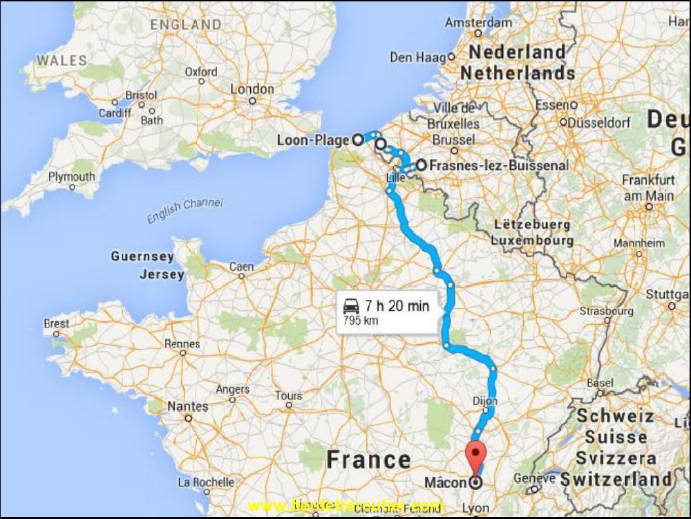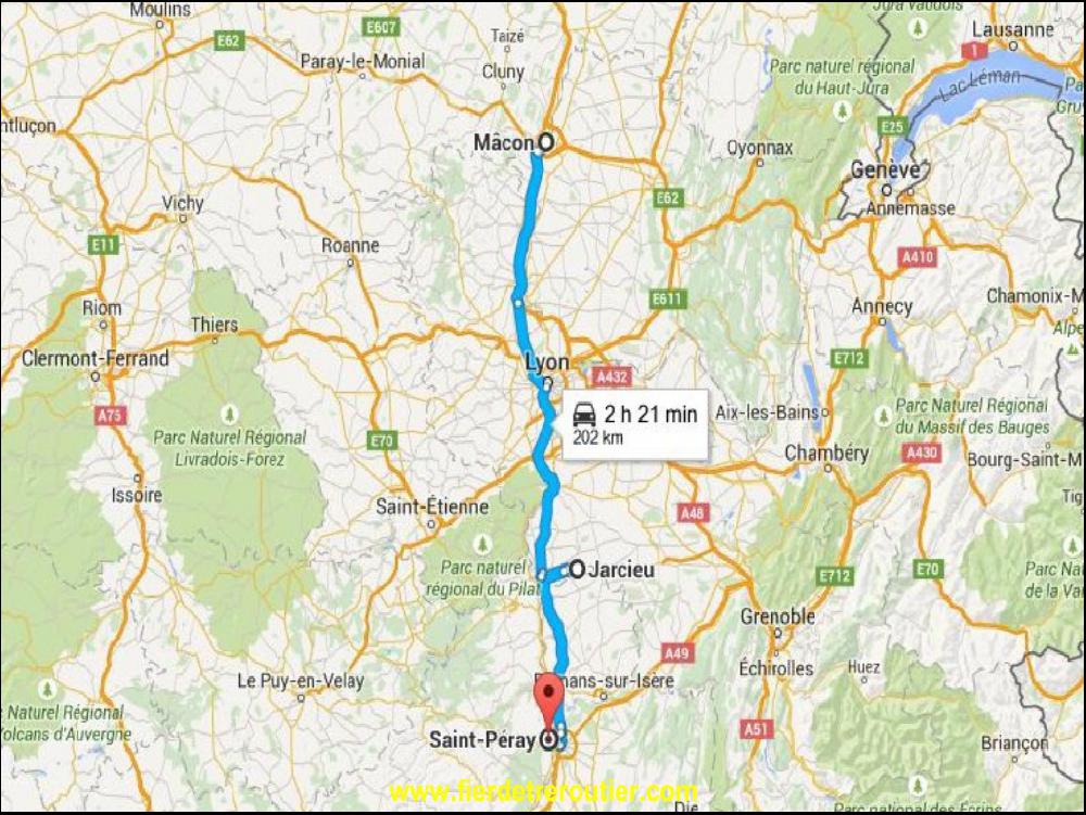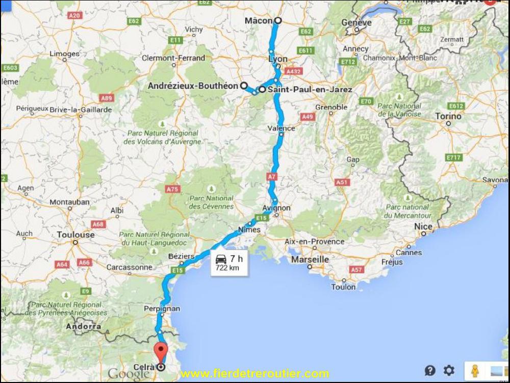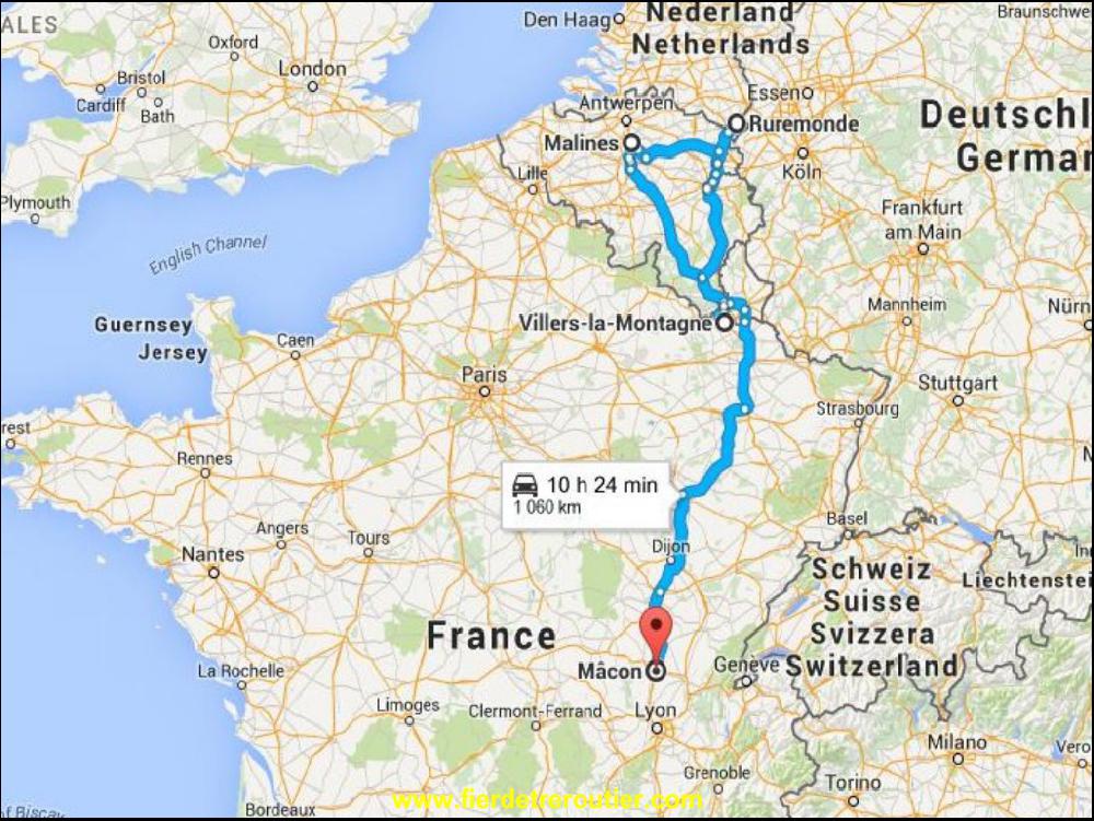 En garçon serieux, avant de partir de fais le point avec Google Trafic, il va faloir eviter Liège cet apreme. Je commence par galerer à Maastricht, c'est comme son traité, un gros bordel. Entre temps la situation a empiré à Liège, je passe donc par Verviers les Hautes Fagnes, comme lundi en fait, mais avec 19T en moins. Donc, ça debaroule au taquet. Je balance un peu de gasoil au Luxembourg et je descends peinard par la N7. J'ai juste galéré pour rejoindre la France ou ça merde encore bien à 19h. Je fais ma dernière pause à Maizières les Metz. Le reste du trajet est une formalité, ça roule extremement bien, si bien que je finis par debarquer au centre routier de Mâcon en 4h28, la classe non ? Je suis comme carrefour moi, j'optimisme !