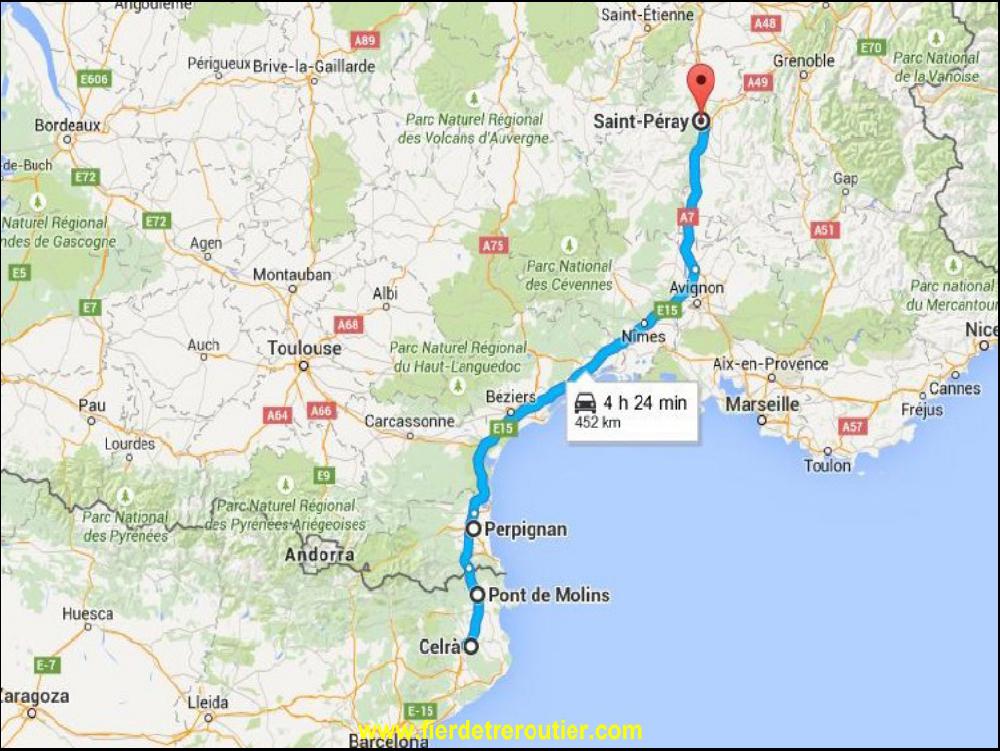 Me voilà reparti avec un camion aux normes Larmshutz, fini le bruit rauque du 13L, et le bruit terrible du turbo, snif, me revoilà mouton et dans les bouchons de ces abrutis de Valentinois qui rentrent du boulot, ici, comme à Lyon, Paris, Limoges, Napoli, le bus est vide et chacun rale dans sa poubelle à credit à propos de la pollution et des bouchons... J'aurai bien fait le crochet à St Peray histoire de mater un peu mes plants de fraises et de tomates, mais la RSE dit NON. Dernière coupure de 30 à Nimes, et après tout debout.com à 83km/h pour atterir comme prévu en 9h49 le long de chez mon client de demain à Celrà, et j'ai donc largement cramé ma 2e 10h de la semaine.