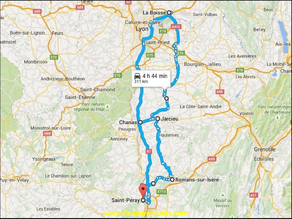 11h de coupure plus tard, me voilà reparti. Je coupe à travers champs pour rejoindre Romans vu qu'il y a toujours ces merdes de travaux sur la N86 chez moi. 6 mois de travaux pour faire 2km d'enrobé, dans le même temps, en 6 mois en espagne, il sont capables de faire 400km d'autovia. Super sympa le jeune à la reception à Romans, je pose 2 palettes dans l'usine d'abats jour, même pas made in china ! De là, j'ai une ramasse à 500M de là, je ferme même pas les portes du frigo. 3 caisses à charger, la semi est presque pleine et je ramène tout ça au dépôt. Je coupe par Margès, c'est plus court et c'est joli.