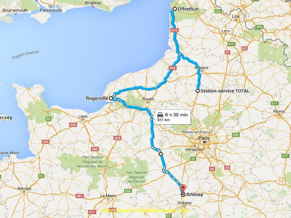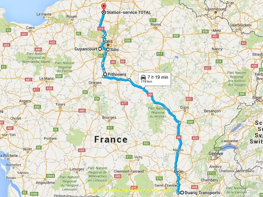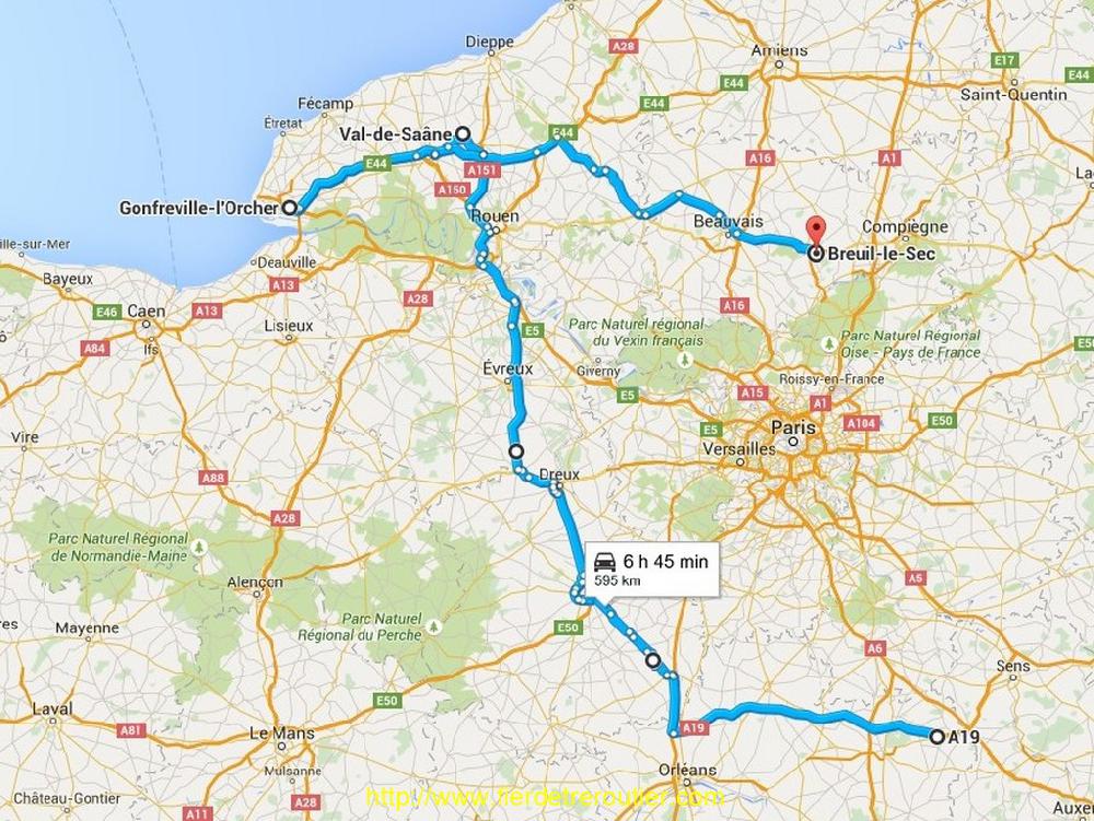 Quand je me suis couché hier soir c'était encore l'été, mais dans la nuit le temps s'est gaté, et il tombe des cordes ce matin... ça tombe super bien, c'est la rentrée, on est en septembre, tout est normal. J'ai eu bien du mal à me lever parce qu'il faisait bien bon au fond du plumard, mais il me reste un soupson de conscience professionnelle, à 5h30 je mets les voiles pour affronter la soporifique A19. Je retrouve u peu d'animation sur l'A10 100km plus loin. Il y a déjà du monde sur la N154, mais je passe assez facilement la rocade de Chartres et Dreux dans la foulée. Il y a de l'enrobé tout neuf pour traverser Dreux, mais pas de rocade digne de ce nom en vue. Comme j'ai bien calculé mon coup, je passe après l'heure de pointe à Rouen et je débarque assez rapidement à Tôtes, je me suis fait une belle frayeur en traversant un petit village, Bertrimont je crois, ou sur la route principale, il y a des STOP pour laisser le passage à des petites impasses, incroyable, j'ai été tellement surpris que j'en ai moitié cramé un, vu les marques de freins au sol, je dois pas être le premier surpris, ça doit taper de temps en temps !! Je finis par arriver entier à Val de Saane avec 4h15 de routas, il était temps ! Le client attendait sa marchandise, je me suis pas magné pour rien, c'est rare.