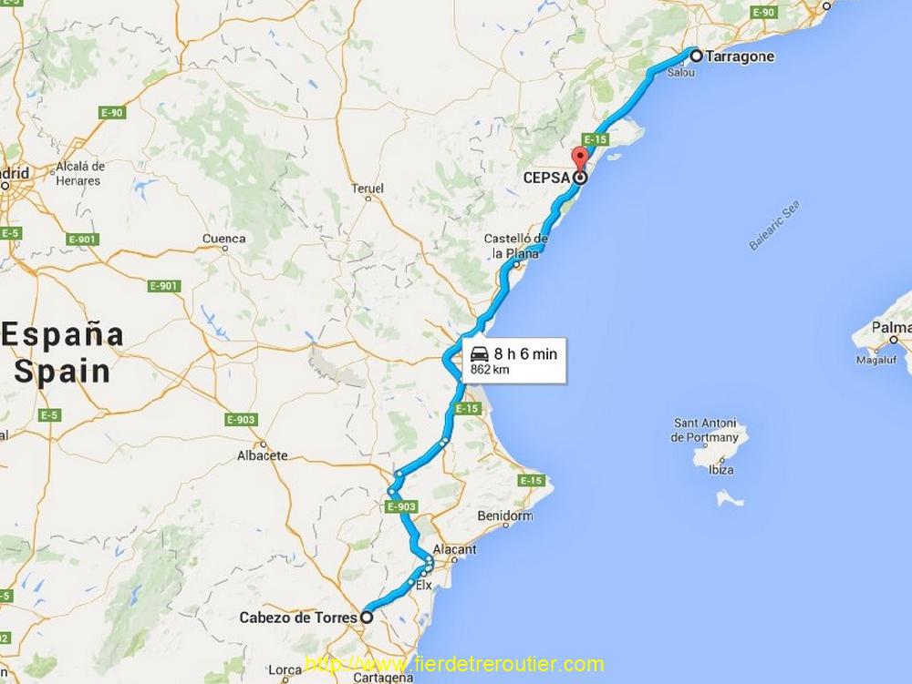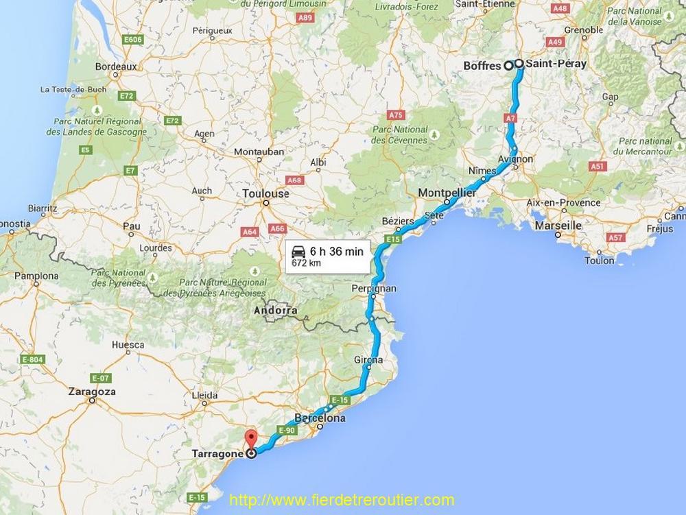 45 minutes et pas une de plus me voilà reparti, pas pour longtemps, je sors à Narbonne histoire de donner du bon gasoil pas cher à bouffer à mon camion, sauf que la ESSO est HS, je suis sorti pour rien, j'ai perdu 5 precieuses minutes pour rien... Donc, j'ai repris l'A9 toujours au taquet et sous le soleil pour tenter ma chance à la TOTAL Express de Perpignan, et c'est pas mal comme station, sur chaque piste il y a de l'ADBLUE et en plus c'est propre !! Sur La Jonquera il y a encore pas mal de touristes, d'en haut, je vois une file de plusieurs kilomètres pour atteindre le Perthus sur la nationale, ils sont completement ravagés ces gens... Plus j'avance et plus je suis optimiste sur mon heure d'arrivée à Murcia, je table sur 11h30. Je ralentis à peine au niveau de Barbera, et après encore une fois au taquet, ce qui me mène dans la ZI du Riu Clar à Tarragone avec 4h20 de route. Il fait lourdingue ce soir, j'étais bien mieux à Beauvais !