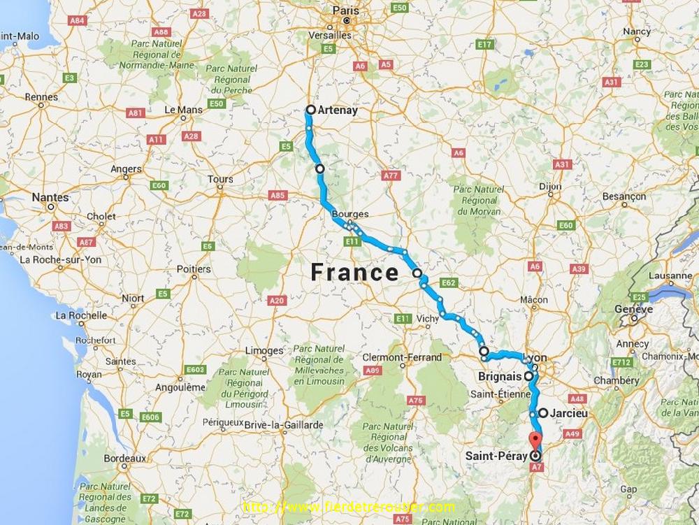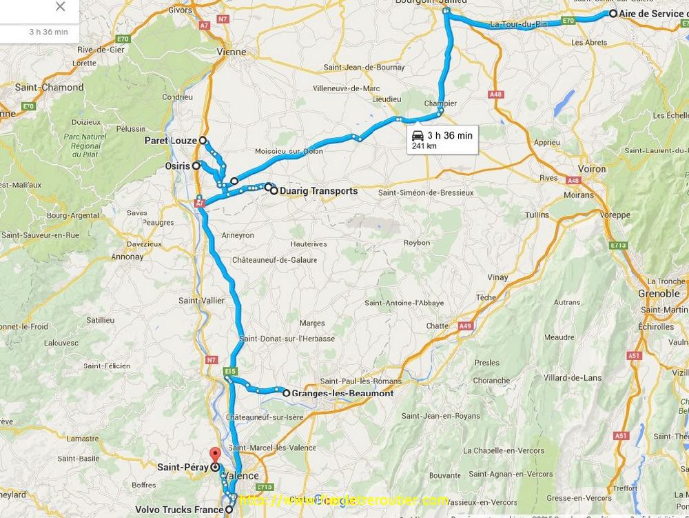 Retour en mode solo liner au dépôt, je reprends le frigo de ce matin et je descends à Granges les Beaumont. Depuis le dépôt, j'aurai pu aussi bien passer par la montagne, mais avec le mauvais temps et la chance que j'ai, je suis bien capable de prendreune mauvaise branche dans la tête, donc A7. Lespaloxs sont vite vidés, je libère le quai pile quand Patrick arrive, ce qui nous évite de devoir se croiser sur le trés étroit chemin de la ferme. Je me pose à Valence le long de la N7, histoire de casser la dalle.