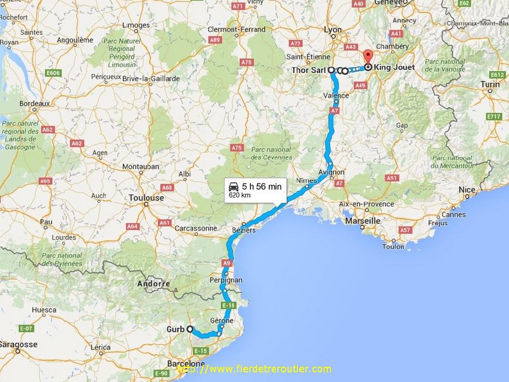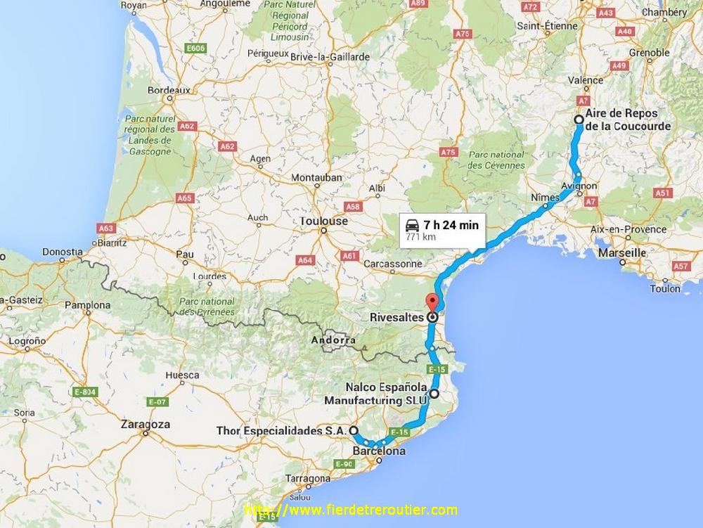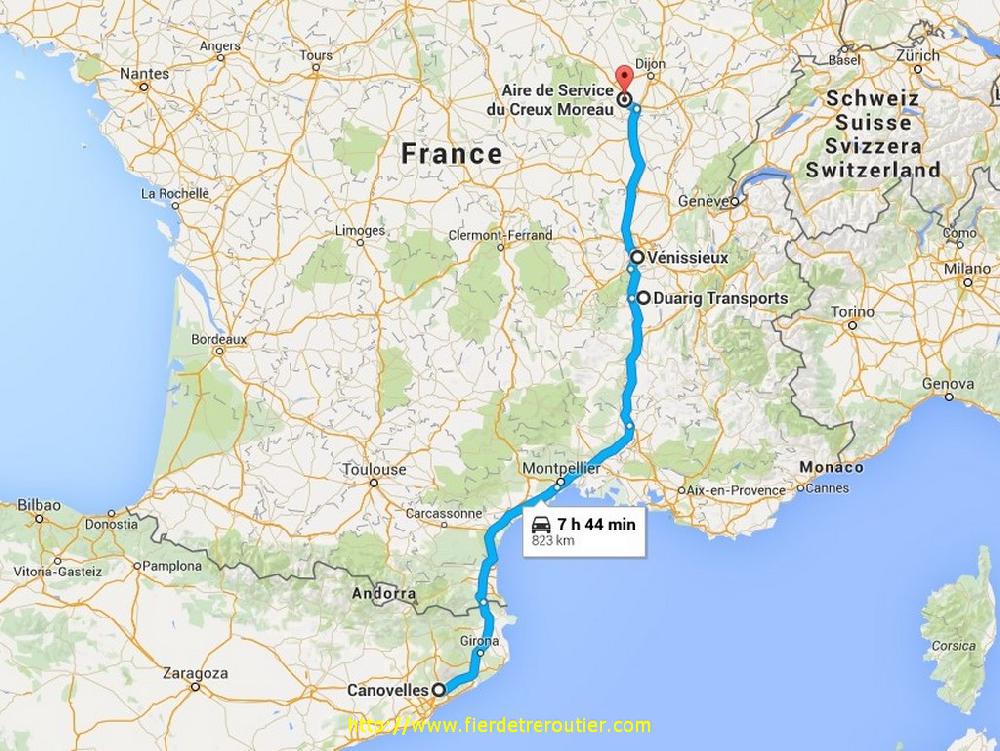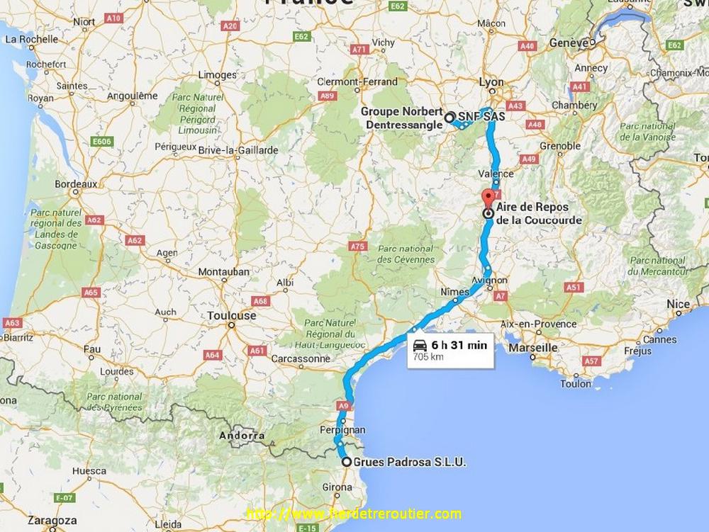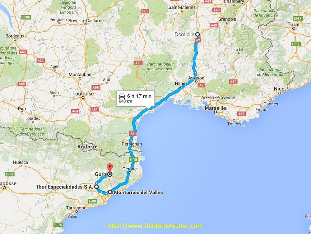 J'ai été réveillé par un bruit incroyable, je savais pas ce qui arrivait, en fait c'était la pluie tout simplement, et étant garé sous un arbre je reçois moins de gouttes mais elles sont plus grosses et bruyantes, je mate l'heure, 1h15, il est donc l'heure de se lever, et ce avant les reveils. A 2h10 je mets en route, dans le poligono desert et silencieux pour rejoindre l'autoroute au plus court, je passe par une route que j'avais jamais osé prendre qui coupe par le centre de Conovalles, de nuit ça se tente, et ça fait gagner au moins 45 secondes. Le pluie m'accompagne de temps en temps, et comme j'ai pas grand chose à faire je revisite la discographie de Placebo, de temps en temps ça fait du bien. Avec 5T dans la semi ça roule comme qui rigole, je monte le Perthus à la régule, un peu comme si j'avais un FH750, car c'est beau de rêver. Je passe même Montpellier sans mettre le moindre coup de frein, trop content, si bien que je debarque juste au moment ou l'alame temps de conduite clignote, 4h15 de guidon, je me jette en même temps sur une place de parking et dans la couchette.