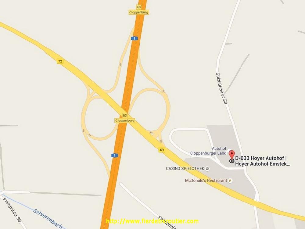 Il est trés precisement 10h10 quand je sors côté germanique, comme d'hab ça pinaille, et pour economiser des minutes, je me gare dès que je peux et j'attends que les douaniers aient fait acte de presence et que tout le convoi soit loin. Ensuite seulement je demarre, et je suis du coup tout seul, oui, d'ici une fois ceux sortis du bateau passés, il y a mathematiquement plus aucun trafic. Je rejoins l'A1 20km plus loin quasi à la régule. Les previsions Google Map sont pour le moment bonnes jusqu'à bien après Hambourg, ce qui n'est pas fait pour me deplaire. Comme disait toujoursma mémé, il faut battre le fer quand il est chaud, et mon pépé Fournet, serrurier et ferronier d'art au 1 Rue du Théatre à Valence (Drôme) ne l'a jamais dementi. Tant et si bien que j'ai debarqué à la sortie 66 Holdorf, soit bien après Bremen en 4h et environ 0 minute. Pour gagner du temps et m'éviter la panne sêche, je mets un peu de gasoil, je me gare et je fais le point. Il est déjà 15h. Donc, pour aller vite, il vaudrait mieux que je squatte 3h ici, laisser passer le coup de buhr dans la ruhr et partir après. Je vais donc me nettoyer sous la douche de l'autohof pour faire passer le temps.