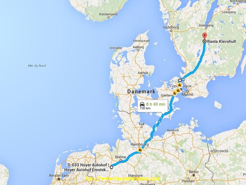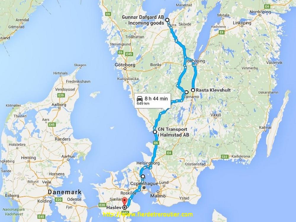 Pour recharger, j'ai un complet à aller charger à Hillerstrup, c'est à peine croyable mais j'ai déjà fait cette ramasse. Je casse la croute vite fait, et je prends plein sud par la même route qu'à la montée, du moins jusqu'à Mujslo, après je bifurque par la cambrousse, quoique par ici, c'est toujours un peu la cambrousse. Comme la dernière fois, c'est bien la misère pour charger les palettes, elles font syle 2m45 de large par 2m de haut, c'est pas hyper lourd, mais à charger au transpal à main, c'est vite enervant parce que ça rentre pas du premier coup vu qu'il faut y aller au jugé, un peu comme quand... enfin, bref, je vous fait pas de dessin, quand ça rentre pas, ça rentre pas. Je repars la semi est pleine pour le departement 76 chez nous en France, mais je ramène tout ça chez GN à Halmstad, on me vide tout et je recharge un complet pour Macon à vider le 30, j'ai le temps ! Sauf que je dois livrer tout ça à Khelen au Luxembourg jeudi matin. Il me reste 2h30 à rouler ce soir, je rentre par le Danemark et j'attrape le Scandline de 20h50, il y a pas mal de monde, ensuite c'est grattage de tête pour savoir ou se poser, il y a pas des milliards de parking entre Copenhague et Rodby, mais il y en a quand même un au niveau de Haslev ou je me pose avec 8h48 de guidon, ça ira bien pour un mardi.