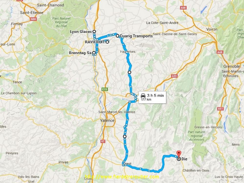 Il me faut encore traverser le Rhône, et passer en zone libre en Ardèche, j'ai 10 GRV d'additif à charger à Andance, magnifique village le long du Rhône. Retour au dépôt pour tout poser, et reprendre 12 GRV que m'amène Alexis pour Die. Donc, pas d'affolage aujourd'hui, j'ai grave le temps de laver, et depuis 15 jours c'était pas du luxe, ça coulait bien noir ! Après ça, un coup de gasoil, un coup sous la douche et j'ai plus qu'à rouler tranquillement à travers champs pour rejoindre Die. Il y a trés peu de trafic, j'ai le temps et je peux donc rouler à la cool, ça repose. Une fois posé dans la zone, j'avais le nez dans mon ordinateur à reflechir pour écrire ces lignes, quand on tape à ma porte, une petite dame qui me demande de l'aider à changer sa roue. Elle est garée un peu plus loin, en discutant, elle me dit qu'elle est aide soignante à l'hopital de Die, juste à côté. En dix minutes sa roue était changée, elle m'a tendu 10€ mais bien sûr j'ai refusé, on va quand même pas faire payer les gens qui un jour ou l'autre vont s'occuper de nous !
