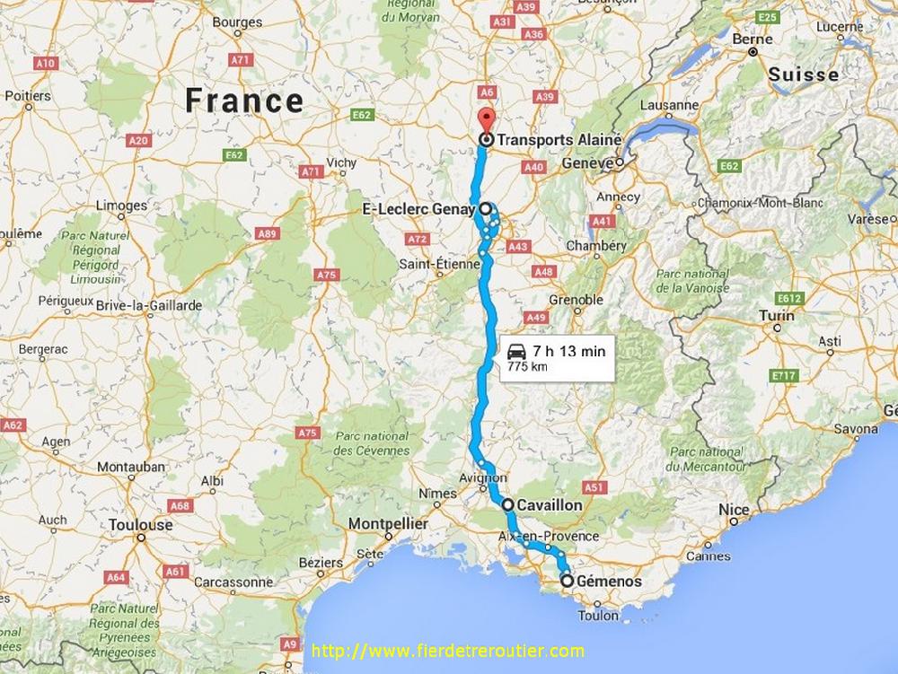 A 19h30, c'est tout bon, les jeunes vont chercher à grossir à Mc Do ce soir, quant à moi je monte tranquillement à Mâcon. Il y a pas beaucoup de trafic, c'est bien tranquillle ! Calé à 81km/h, je mets exactement 2h10 pour arriver à Mâcon Nord ou je laisse le frigo pour Hubert et je récupère sa taut qui est chargée pour Gemenos. On traine pas, Hubert est explosé et mon amplitude commence à grogner. Je roule ce que je peux en redescendant, ce qui me fait atterir à Genay le long du supermarché Leclerc, tranquille pour un lundi 2 mai.
