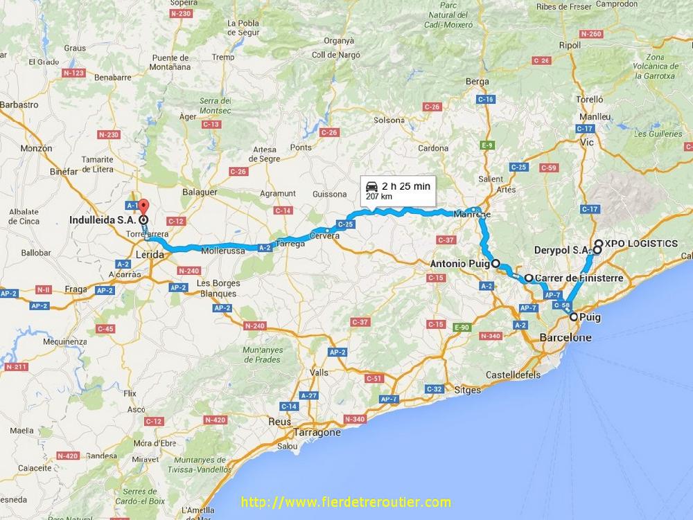 Retour sur Barcelone SUD, ça roule impecc, contrairement à l'A2 ou il y a un gros bouchon, je livre les 6 dernières palettes à Viladecans, une éternité que j'avais plus posé une roue ici, du moment qu'on tire les palettes, ça va toujours aussi bien. Une fois vide, je vais tenter de recharger à Alguaire, au fond de moi j'hésite entre foncer ou trainer, sachant que le dernier coup je suis resté 21h sur place... Bon, je me hâte lentement finalement on vera bien. La vérité c'est que j'avais envie de boire un coup à La Panadella, j'ai hésité un moment, et j'ai filé, merde j'ai encore un brin de conscience professionnelle, il fait vraiment chaud cet apreme, on frôle les 30, il va falloir reprendre le short et les tongs bientôt !