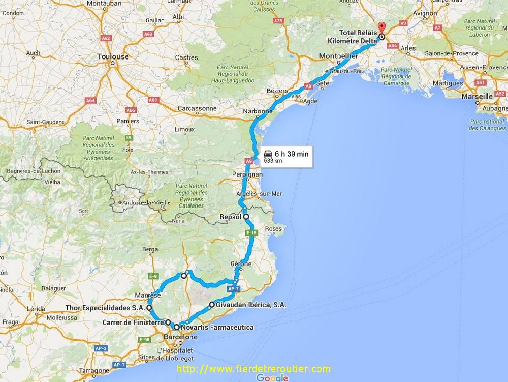 Avec déjà 4h52 de routas, je pourrais pas aller aussi loin que je le voudrais ce soir, mais bon, c'est la vie. De plus c'est presque misereux pour sortir de Montélimar ce soir, su l'A7 ça roule pas mal aussi, il y a du long week-end dans l'air. Le soleil est en plus de retour sur la Rhône Valley, je croise un nombre incalcullable de collègues qui remontent cet après-midi, il y a cligno light show sur l'A7 et l'A9 ! Passé Beziers le temps se brouille à nouveau et c'est quasi l'apocalypse dans les Corbières, mais heureusement ça roule nettement moins qu'à 18h. J'hésite arrivé à Perpignan à couper par là, mais je voudrais bien tenter d'aller au bout du bout des heures, ce qui m'amène in extremis sur la station de l'AP7 à La Jonquera, garé comme une merde, mais en ADR j'ai pas trop le choix dans le coin ! Bref demain je décollé à 7h15.