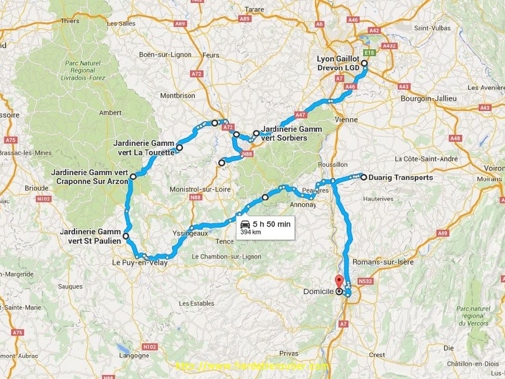 C'est le client qui me reveille au téléphone ce matin, ça fait bien ! Bravo Phil26, l'image de marque de la société vient de derouiller, mais, c'est qu'à moitié de ma faute parce que la veille il m'avait dit que ça serait prêt pas avant 8h alors hein. Je prends quand même le temps de finir mon petit dej, et GO. C'estla panique sur le quai, il y en a dans tous les sens. Pendant qu'on me rapproche les lots à charger je fais mes CMR en essayant de visualiser comment je vais m'organiser, il faudra bien une heure pour charger, hier je me posais des questions pour faire Firminy-La Tourette, mais au vu des réponses, j'ai ma solution. Il est presque9h quand je lache le frein, ce qui signifie que ça roule nickel, tout le monde est au travail, l'A46 et l'A47 passent comme une lettre à la poste, si bien qu'en 56 minutes je débarque à mon premier Gamm Vert de la journée à Sorbiers, pour ne pas être débordé, j'empille direct les vides. De là, j'enchaine avec Villars, un immense magasin, mais le receptionaire doit être nouveau, il pige que dalle dans les rolls, du coup la file de camions s'allonge derrière moi, j'ai honte, le dernier de la matinée est à Firminy, grâce à moi les Appelous ne manqueront pas de plantes !