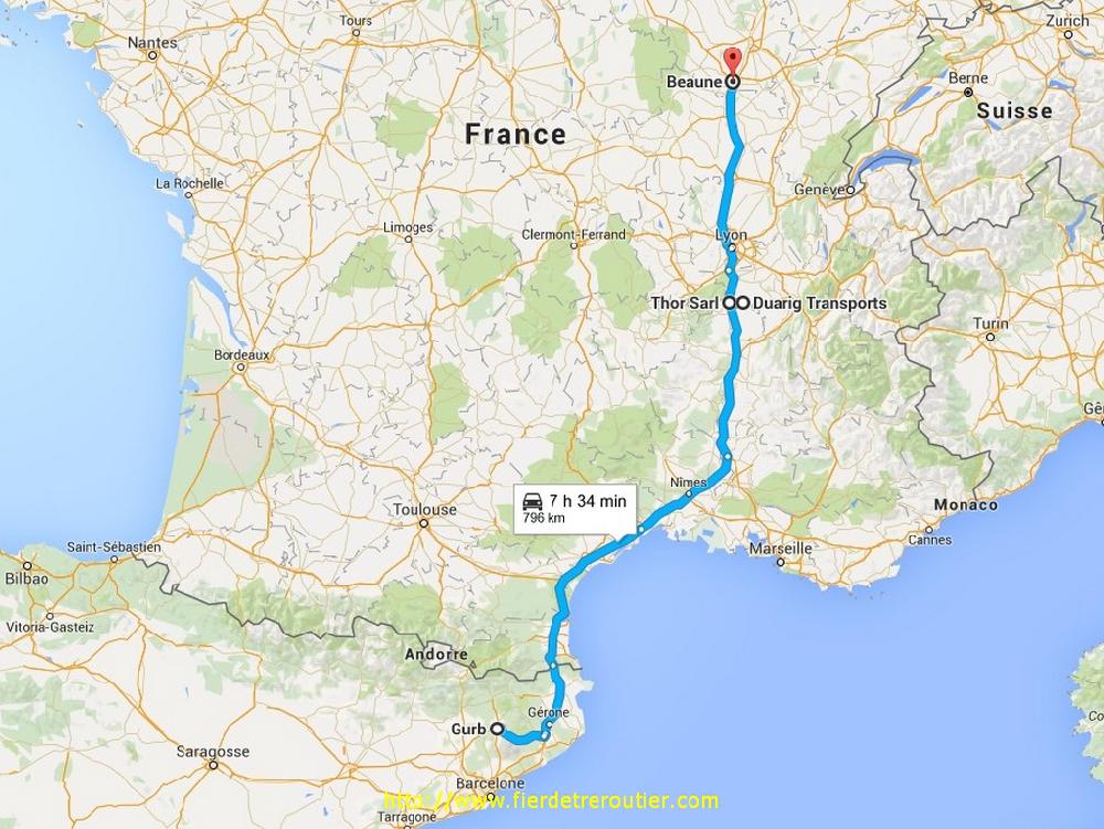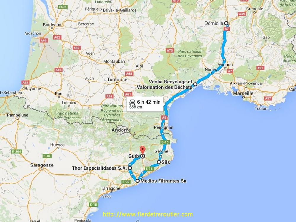 A midi pile, je vois arriver le gardien qui vient chercher un camion, le truc incroyable, c'est moi ! J'y croyais plus. C'était bien 1h30 allemande ! Après 2 mises à quai et 2 pesées vu que j'ai 2 produits, je peux partir, il est 13h, le groupe est calé sur 4°, et le soleil se joint à nous, ce qui n'est pas completement desagréable. Il va falloir pas trainer cet après-midi parce qu'après avoir perdu tout ce temps, il va quand même falloir vider ce soir à Margès, de préférence il faut arriver avant 23h30. Bien, bien bien bien, je me fie à mon flair ainsi qu'aux indication que calcule Mr Garmin, ça devrait le faire, pas large, mais ça devrait quand même. Parce que je suis fou, mais pas con non plus, je m'arrête faire mon gastro à Gurb dans la ZI le long du C25, histoire de pas perdre de temps, le seul vrai crochet que je fais c'est le passage aux clopes à Girona, et dire que je fume plus ! J'ai 4h26 quand je me pose à l'aire de Fitou après avoir essuyé plusieurs orages, on s'en sort pas cette semaine !