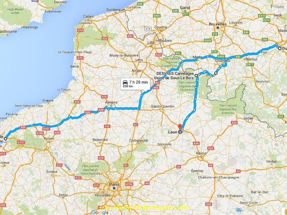 De là, j'ai plus qu'à traverser un autre bled tordu mais autorisé, Beaumont, et quelques kilomètres plus loin je suis de nouveau dans le pays des 36000 fromages et des 60 millions de moutons dont je fais parti, je rejoins non sans avoir visité Louvroil vu que j'avais une adresse à la con. Epuisé ! Il y a pas mal de camions en attente, mais ça va relativement assez vite, j'ai aperçu un ancien collègue de chez Lubac qui est chez Bonnet, je suis pas le seul en frigo à recharger du carrelage finalement, même si ça vaut pas Castellon ici. Comme il me reste 3m de plancher, j'attends sagement les instructions qui arrivent finalement 1h30 plus tard. Du coup, je me coltine la N2 après 16h et c'est vraiment pas de la tarte, je pensais en 1h30 pouvoir aller sur l'autoroute, mais non, je me suis posé in extremis dans une ZI juste avant le péage, nickel chrome ! Y a de l'herbe, des oiseaux, je suis bien là !