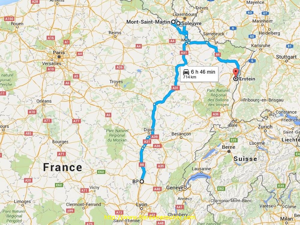 Mon chef qui pense à tout, me fait rejoindre Morad pour que je lui file mes IBC vides, il a la place, et que moi je suis sensé charger ras la gueule. Donc, je contacte Morad et on se met d'accords pour se rejoindre à Mont St Martin, sur la parking de la douane, il y a de la place. Grosso Modo on arrive en même temps. Il a de la place, effectivement. Environ 13,60M mais par dessus les big bag. On se met côte à côté, et depuis le hayon, il faut remonter les cuves pas vraiment toujours vides vu qu'il reste à chaque fois du produit au fond, bref on en a bavé, mais au final on y est arrivé. J'abandonne donc Morad, et je repars à vide direction Strasbourg. Au départ, je voulais couper à travers champs, et puis vu que j'avais déjà 5h47 je me suis dit que ça serait pas plus con de rouler à donf sur l'A4 puisque je GPS m'annonce 3h06 pour aller à Erstein. Donc, je tente ! J'ai vu le premier rayon de soleil de la journée au moment ou j'ai passé le panneau Alsace. Il y a vraiment longtemps que j'étais pas passé dans le coin, j'ai même pas souvenir d'y être passé une fois de jour, j'aurai au moins remarqué l'espèce de canyon au milieu du grè. Strasbourg après 19h c'est du velour, si bien que je me pose largement dans les temps le long de la N83 à Erstein, face au portail de mon client, j'ai RDV à 9h demain, tranquille Emile ! Je valide ma 2e 11 et le tout en moins de 9h de route, moi je dis : facile !