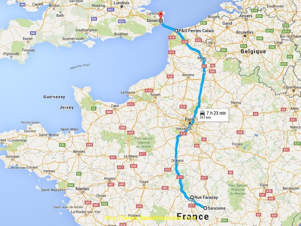 J'ai l'air malin, hier je faisais un speech sur le soleil en pleine poire, et là, pour le coup, fini soleil, à plus soleil, parti, aurevoir, il fait moche, on se croirait dans l'Allier. Une chose est sûre, on dors tréééééés bien ici. Il y a bien quelques relayeurs de la night, mais sinon RAS, du four stars ! Je demarre à 7h30, à 31 je suis sur la magnifique nationale 76 direction Bourges. Etrangement, il y a pas trafic ce matin sur la 76, mais c'est juste au passage du village de Blet que je croise une colonne de camions, faut le faire quand même ! Comme c'est les vacances scolaires, le contournement de Bourges passe nickel, à 8h15 je suis chez le client. 3 colis à poser, ça va très bien. Je peux considerer que j'ai fini ma journée de livreur, j'ai plus qu'à rouler direction la perfide Albion aujourd'hui, mais avant ça, il faut se décider par ou passer d'ici.