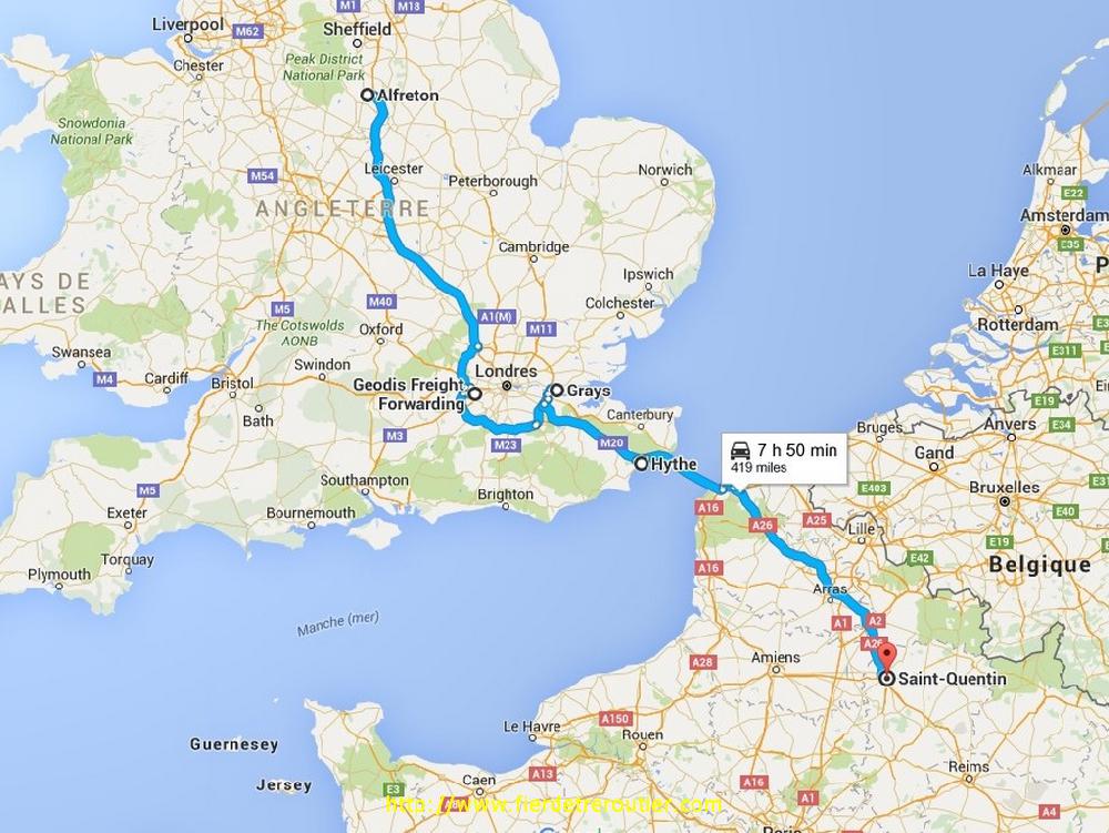Pour tout caser, il faut pratiquement tout rebouger, le cariste est pas mauvais, ça arrange bien la sauce, pour repartir il m'indique une autre route qui s'averera bien meilleure, ça bouchonne toujours autant dans l'autre sens mais pour moi ça va à peu près et tant mieux parce que mon amplitude commence à prendre un coup, il faut en plus que je m'arrête faire une douane à Hythe juste avant le tunnel. Au guichet devant moi, il y a un type à qui on donne un bip, quand il demande en gros combien de temps, le transitaire annonce 2H00 ! Donc, quand je donne mes papiers je m'attends à prendre un gros coup sur la tête, mais le gars me dis de revenir dans 10 minutes ! Effectivement, l'affreteur a bien fait son job, je serai resté 14 minutes arrété, impec ! Respiration !!! Seconde respuration positive au tunnel ou j'attends pas pour embarquer, ça drope... Finalement c'est à 21h57 que je pose mes roues à Coquelles, je sais pas si c'est l'effet match mais il y a absolument personne sur l'A26, ça roule à fond jusqu'à St Quentin ou je sors pour me garer dans une ZI parce que dormir sur l'A26 à cette heure-ci c'est impossible. Quand je prends mon téléphone, j'ai des centaines de messages, entre les textos, le forum, facebook, je sais plus ou donner de la tête, je suis vraiment touché, grosses bises à tous ! Minuit pile je suis garé, NICKEL !