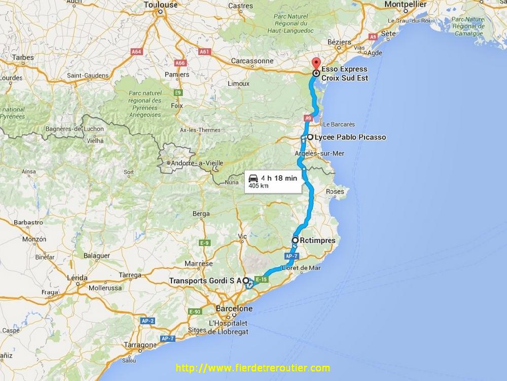 Du coup, j'ai carrement coupé 3h à Padrosa. Je regardais petit à petit la carte google virer au vert, à 21h45 c'était nickel. Plus personne au Perthus, et encore des pompiers en stand by en bas juste avant le péage. Y a des cendres de partout. Je remonte jusqu'au centre des international truckers of la Croix Sud à Narbonne, Aurélien m'a gardé une place, bien gentil ! 23h et des boulettas finito.