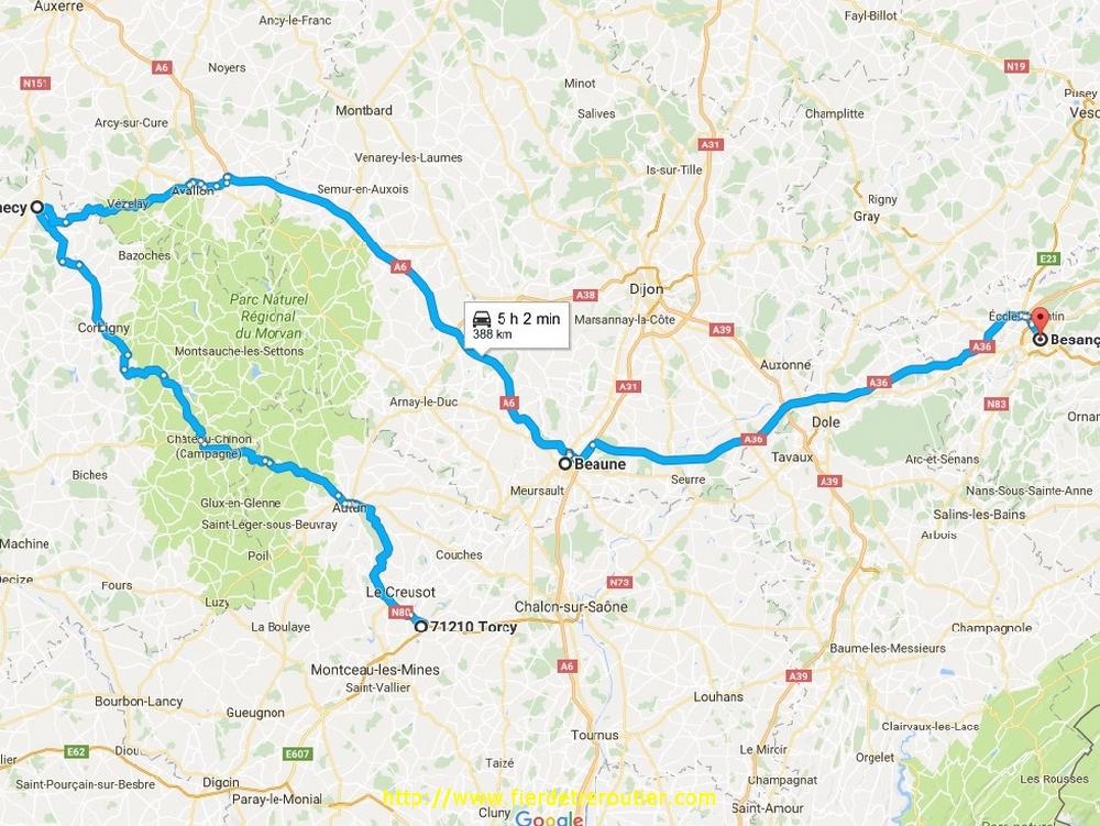 Du temps, je me suis rencardé pour la suite, et ça n'a pas collé. La livraison dans le 45 est annulée vu que c'est fermé jusqu'au 15 août. Une fois vide, je vais pas non plus livrer dans le 91, mais il me faut rejoindre Charly qui monte sur le Fort de Nogent avec un peu de plancher de libre. On se mets d'accords pour Beaune. Comme j'ai un peu de marge, je garde la N6 après Avallon. Quelle erreur. J'ai tout eu ! Convoi exceptionnel, tracteurs, grumeaux, tout tout tout ! Il manquait que la neige ! Finalement j'ai plus que 20 minutes d'avance sur Charly. On passe plus de temps à chaper que pour s'echanger la palette. J'ai de la tchatche, mais l'ancètre me bat à plates coutures. Quoi qu'il en soit, je préfère que ce soit lui que moi qui aille au Fort de Nogent !