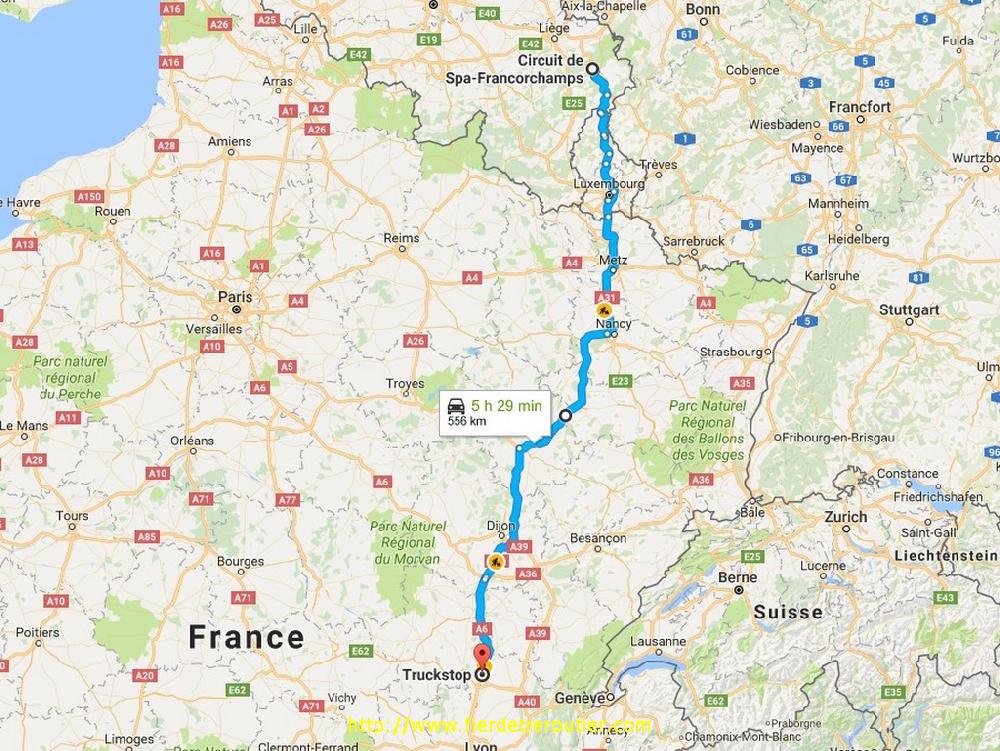 Il est 14h30 quand je finis par repartir avec quelques palettes pour Spa et de la ramasse que je vais gentiement ramener au dépôt. Je suis passablement en retard, car je suis attendu à 9h à Spa. Quand je repars du dépôt ça bouchonne déjà sur Lyon, ça m'arrange pas et du tout coup je passe par Cour Et Buis, mais chargé lourd de chez lourd, c'est pas le top. Je respire une fois sur l'autopista, après ça roule peinard calé à 82. D'ailleurs, je me suis fait doubler par Cedric DCT qui m'a fait remarqué que je faisais du tourisme, oui, et alors !? J'ai le droit !!! Mais l'effronté aurait mieux fait de s'arrêter à Macon ou il m'aurait raqué un mojito, mais il est bien trop radin.