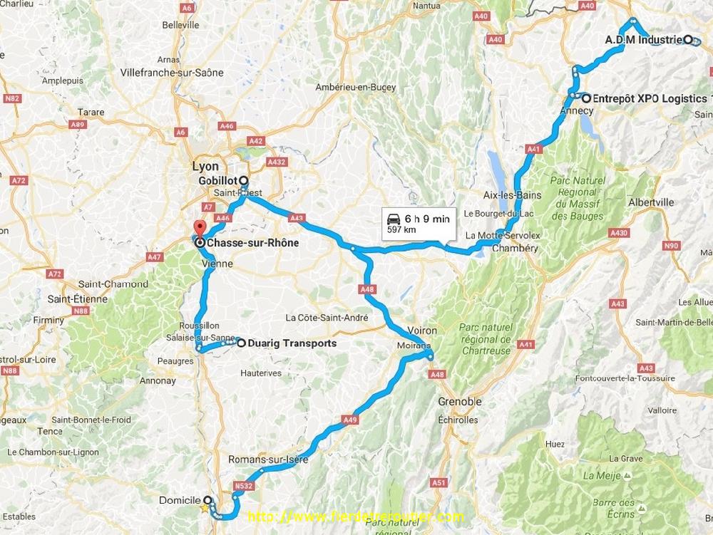 Une heure plus tard c'est chargé, avec un RDV à 10h30 je suis largement dans les clous, même les bouchons à l'entrée de Valence à cause de travaux, ne me mettent pas en retard, la preuve, quand je donne mes papiers à la miss bascule il est l'heure des horlogers, soit 10h10. Mais voilà, j'ai exactement 24h10 d'avance. Je suis en fait prévu demain à 10h30, la honte ! Plutôt que de risquer de moisir la journée ici, le chef me fait rentrer, on transvase les palettes dans une autre semi au dépôt. Du coup, j'ai plus qu'à relaver le plancher ce qui m'occupe un petit moment. Une mission incroyable m'attends, il me faut aller charger des mini paloxs au CAT à St maurice l'Exil pour Roussillon, ça doit faire pas loin de 12km, ce qui constitue un des plus courts voyages de l'année 2016. De là, retour pour deux ramasses à Romans, c'est le vrai boxon sur la capitale de la chaussure cet apreme, je sais pas si c'est du au soleil magnifique de ce jeudi, ou aux soldes, ou plus problement, juste pour me faire chier ! Quand je suis à la seconde ramasse un gars me lance un trés aggressif, hé ho, nous on ferme à 17h, t'as de la chance, à quoi j'ai répondu qu'au pire on aurait chargé demain, ben oui, c'est vrai quoi !