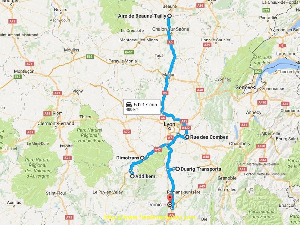 Pour rejoindre le dépôt, j'ai voulu éviter l'heure de rush à St Etienne, du coup j'ai élaboré un mauvais plan B via la RCEA que nous envie la terre entière, je sais pas ce qu'il ma pris, une folie. Du moins, ça a bien roulé jusqu'à Macon, et là, ça s'est gaté, circulation alternée, 20 minutes pour faire 2km, ensuite accés vers Lyon au péage fermé, du coup c'est la N6 surchargée jusqu'à Belleville, je passe tranquille par les hauteurs de Vienne. Au dépôt c'est un vendredi assez calme, il y a pas grand chose sur le quai, je laisse toutes mes ramasses sauf un le lot que j'ai pris à St herblain, que je viderai lundi à 8h à Montéléger, facile !! Il est 20h30 quand je me radine à la maison, et au moment de fermer le camion, je sais pas sur quel bouton de la télécommande j'ai appuyé, mais le klaxon s'est mis en route, j'ai rameuté tout le quartier jusqu'à ce qu'à force d'appuyer de partout ça finisse par s'arrêter. La honte !