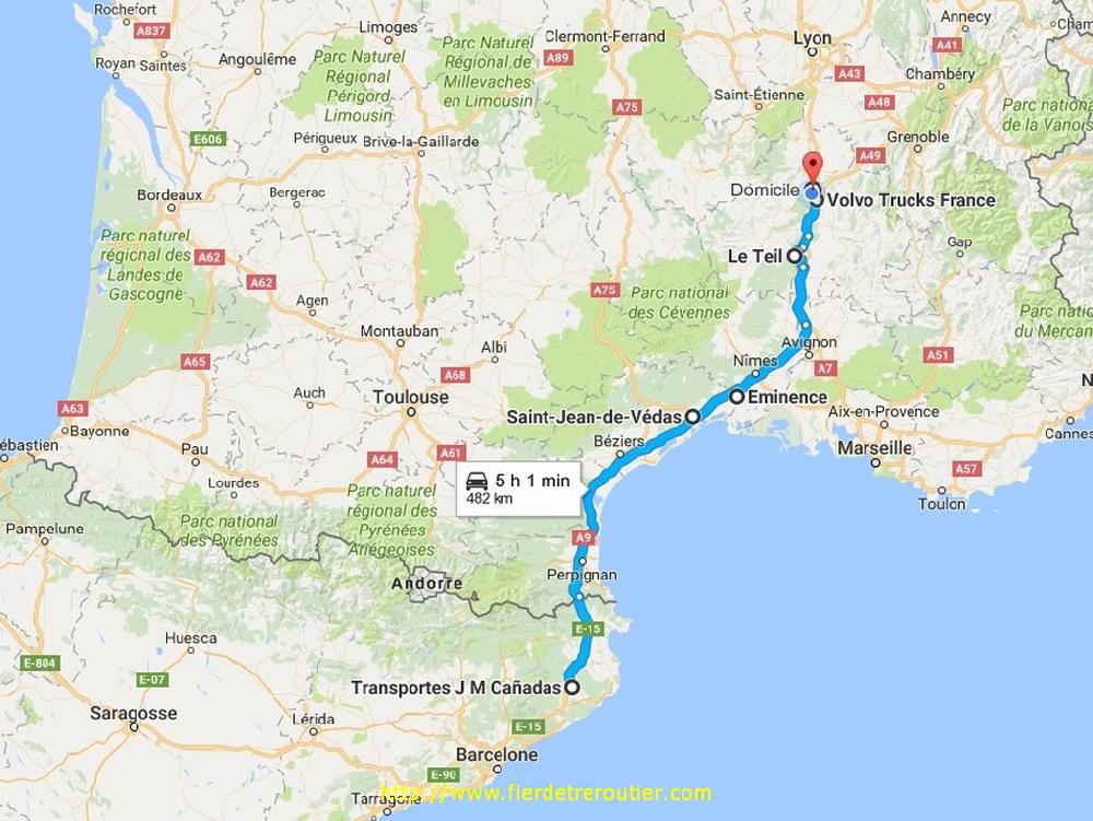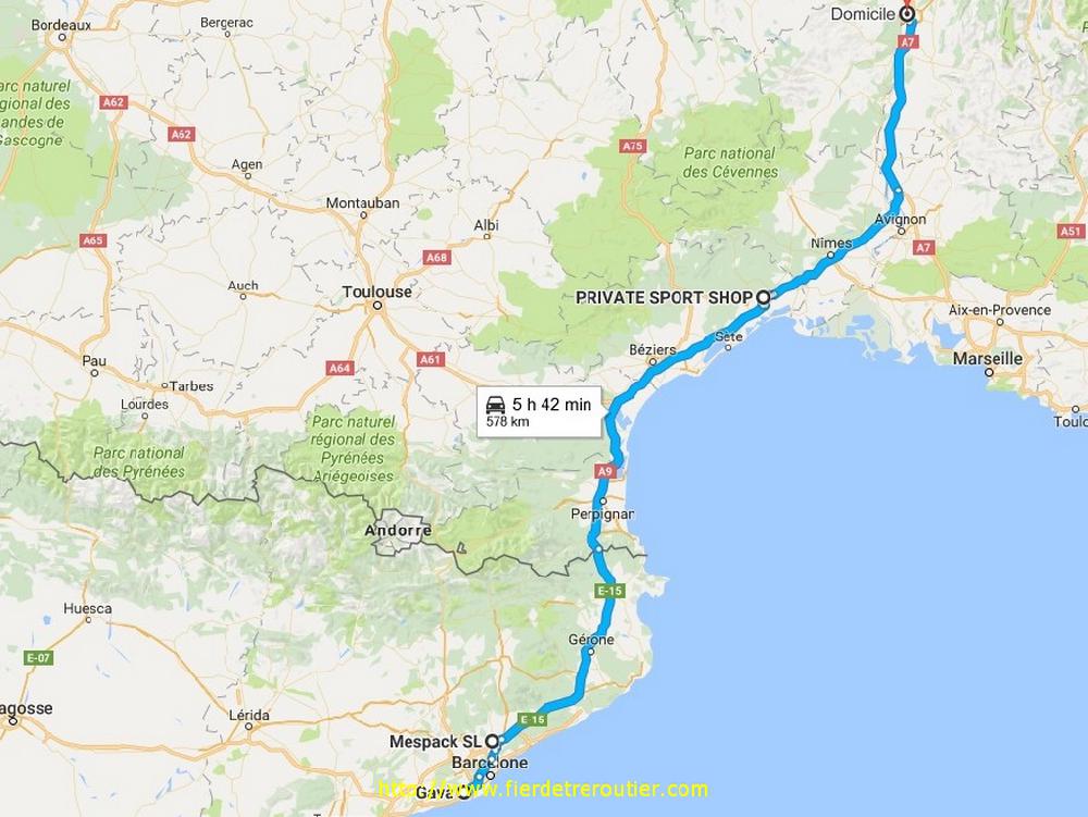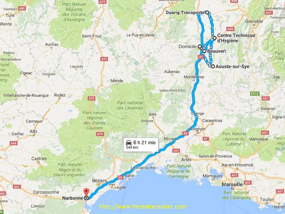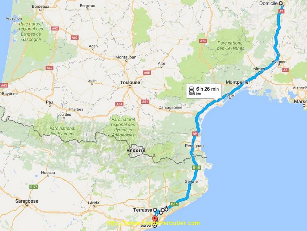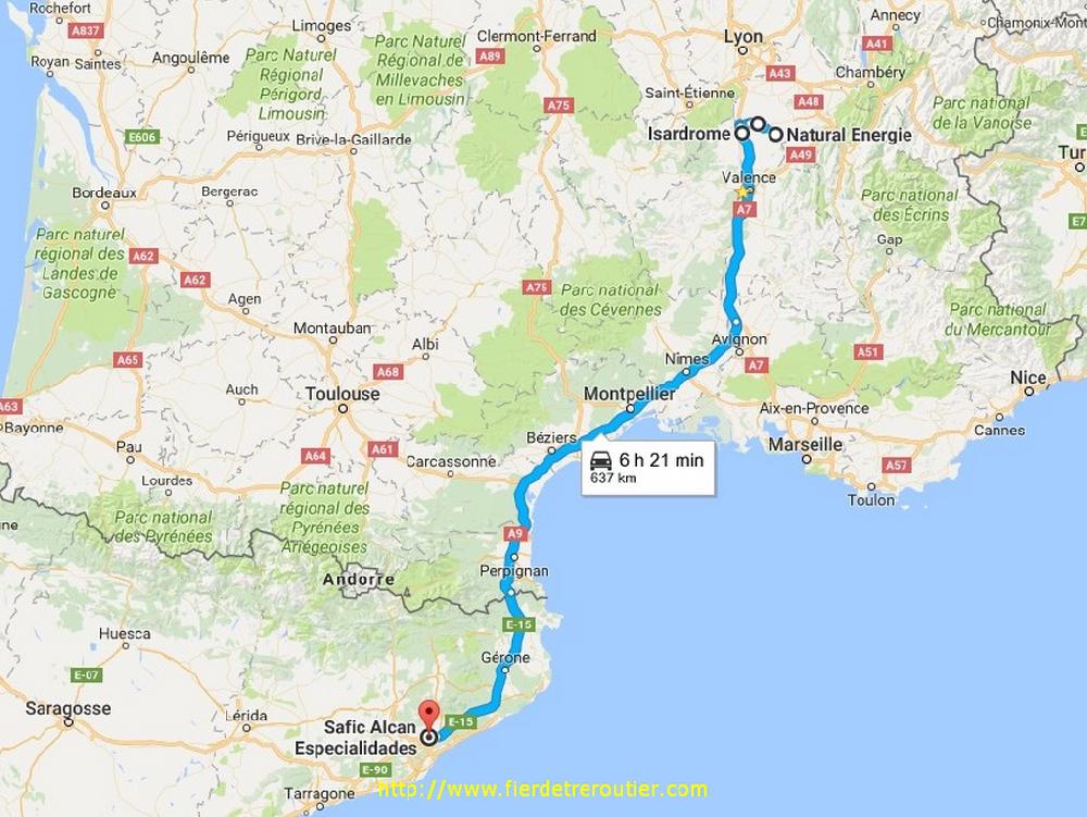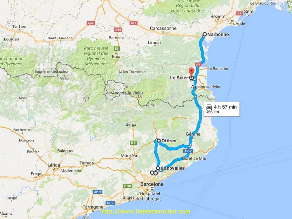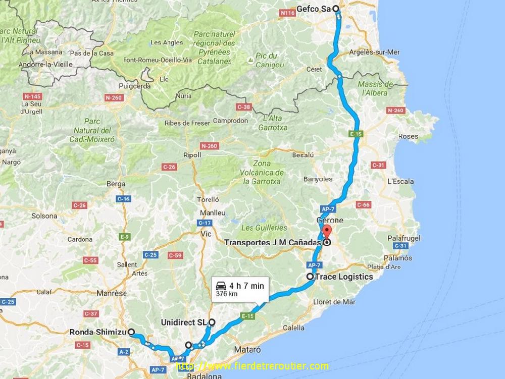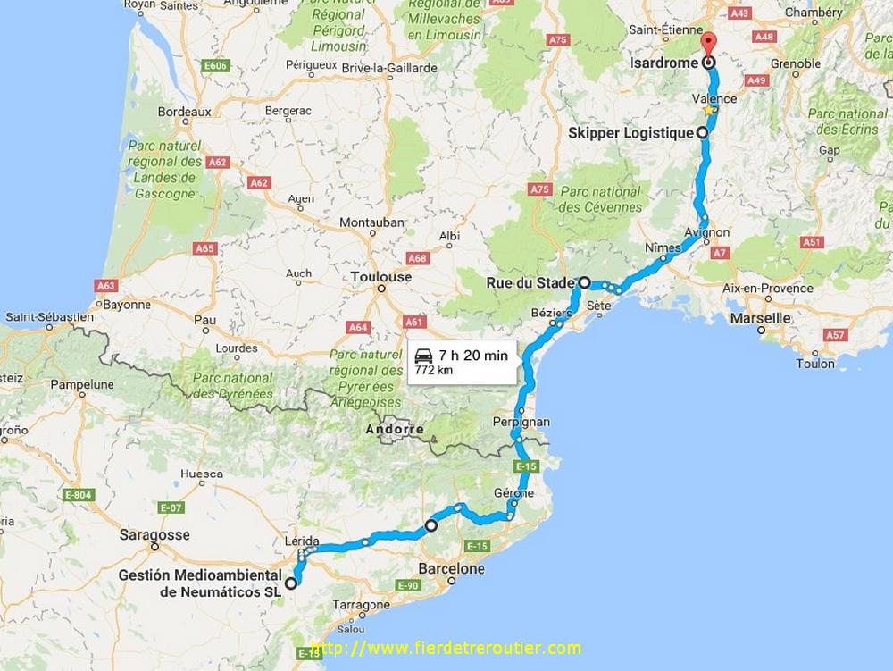 Je ramène bien tranquillement les 27T de buchettes de bois à Jarcieu et je decroche le tout pour récuperer, chose incroyable mon frigo qui moisit là depuis 2 semaines quasi. Comme c'est mon jour de chance, j'ai une tournée facile avec 2 livraisons à Barcelone, au départ je devais faire un Martorelles/Granollers, mais le Martorelles était un peu trop lourd, j'ai donc chounié pour avoir un peu moins lourd sur le cul sachant que la météo était pas forcement favorable, du coup je me retrouve avec du Santa Perpetua et le Grannollers, impeccable ! La descente vers le sud a été impeccable du coup jusqu'à ce que je me souvienne qu'à Narbonne il y avait un centre routier ou je pourrais éventuelement prendre une douche, moyenant la somme de 2,90€, j'en ai aussi profité pour acheter une oreillette, car definitivement mon poste ne veut pas reconnaitre mon téléphone, il boude !