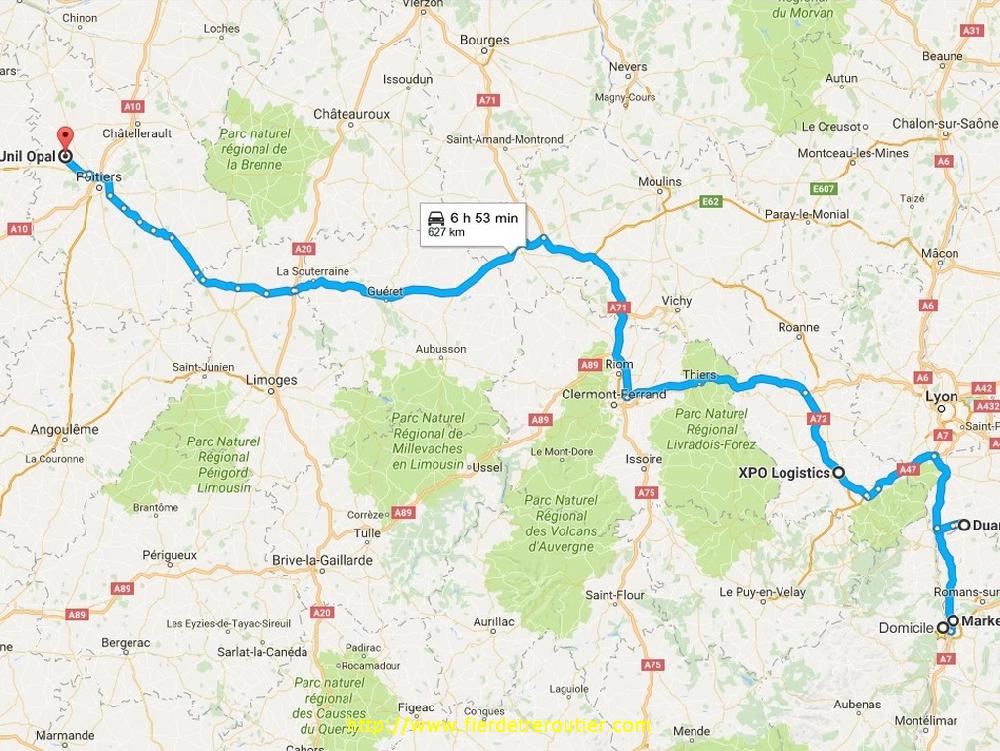 A 12h30, je décolle, avec mes 3h de coupure et surtout les papiers faits, je ne suis pas pour autant tranquille, mon chef ne pouvant se passer de moi, je reviens au dépôt pour une triple séance de decroche raccroche, heureusement, il ne pleut pas. J'ai deux semis vides à aller charger à Anneyron pour Versailles, j'ai bien vu le moment qu'il fallait que j'en fasse une 3e rotation, mais heureusement c'est Lionel qui m'a sauvé la vie et à courageusement fait la dernière. Je raccroche enfin mon beau frigo, un peu de gasoil et je rentre passer la soirée à ma maison, comme je suis un garçon prévoyant j'ai quand même fait quelques courses à mon Intermarché préféré parce qu'on sait jamais !