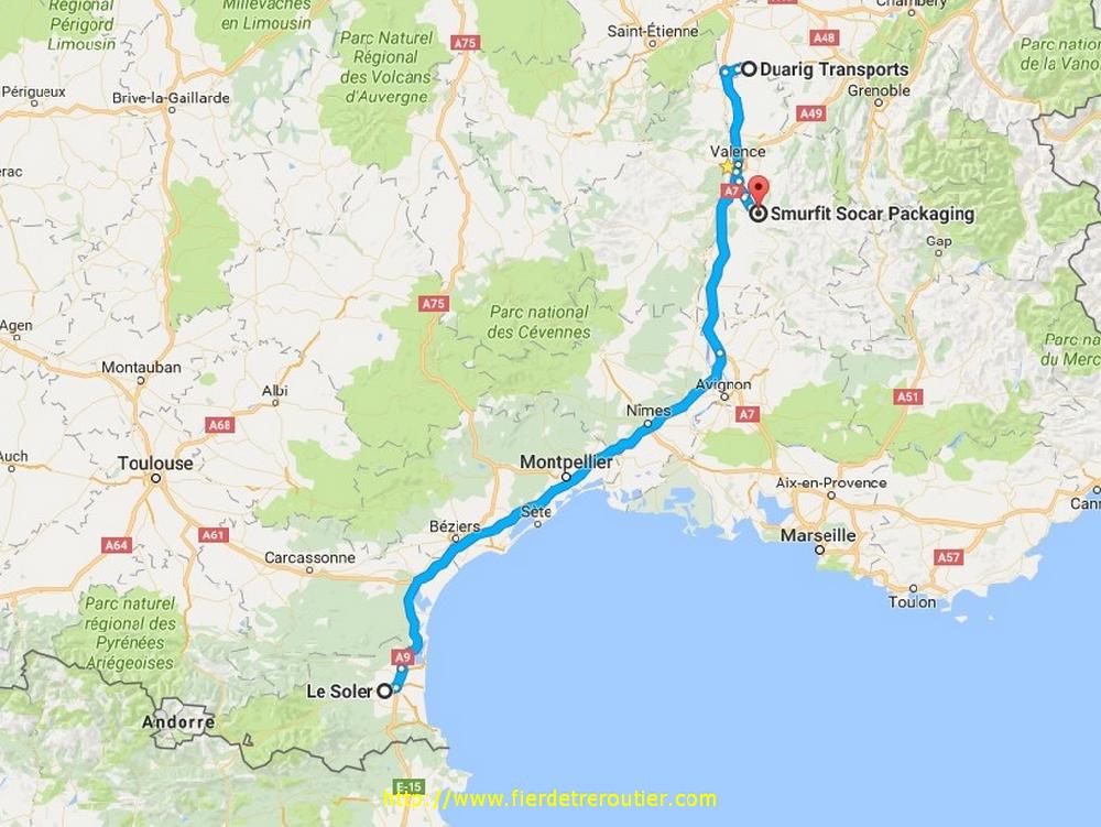 Quoi qu'il en soit, je suis comme le cariste, j'ai faim aussi, alors je sors de là direction Vic et je me pose dans une ZI pas loin au calme pour faire ma petite salade tranquillou. De toutes façons, je ne suis prévu qu'à 16h chez le fabricand de cuisines en kit low cost. Alors je prends mon temps, de toutes façons, ça glisse. Quand je repars il est presque 17h, je dois rouler direction la catalogne du nord, la catalogne française, au péage du Boulou, les Douanes Françaises filtrent les voies de péages et ça bouche, ils ont tellement bien filtré qu'ils ont arrété deux ou trois camions et un couple de papy mamy, un peu plus loin 3 grosses voitures me doublent dans un mouchoir de poche, si vite que ça m'a fait bouger le camion, sacré Go FAST, j epense qu'avec la Megane ils les rattraperont jamais. Finalement j'ai le suite, 4m de plancher à Le Soler ou je debarque vers 20h et la pluie a cessé, c'est vraiment magnifique quand on y pense !!! Allez, c'est ma semaine fegnasse, impecc, je valide une 11, nickel chrome !