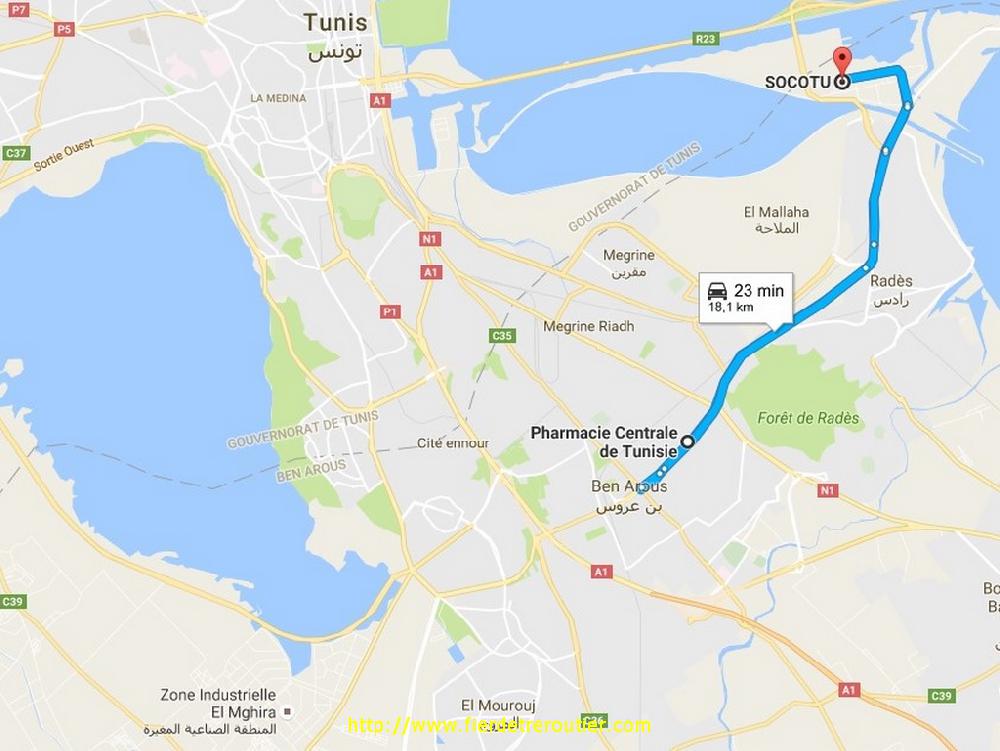 Karim arrive donc vers 15h pour nous faire degager. J'ai du stock en tablettes de chocolat à distribuer en vue de sortir sans trop de dommages d'ici. Passage au scanner, une tablette, passage aux douanes de sortie 4 tablettes, attente quand même, puis au moment de passer le stop, arrêt en catastrophe par un flic en armes qui monte vilement côté passager, retablette. Enfin, on est dehors et c'est Walid qui prend le relais pour aller faire les livraisons, j'ai bien roulé environ 2km jusqu'à un rond point ou un douanier particulièrement aggressif nous arrête à nouveau, mais après avoir retourné les papiers, le passeport et visité la cabine, retablette, mon stock a pris une claque. De là, j'ai fait environ 8km sans aucun contrôle à travers la banlieue de Tunis, c'est sûr on y est, mais quel dommage de ne pas rouler un peu plus loin, juste pour voir !! Quand on arrive à la Pharmacie Centrale, tout le monde est sur le pied de guerre pour nous accueillir, c'est assez rare de rentrer comme ça dans une boutique tellement on est habitués à devoir se faire contrôler AVANT, mais vu ce qu'on a djà subi comme contrôles.... Romain vide avant moi vu qu'il a que 7 palettes ici et surtout une autre livraison de l'autre côté de Tunis.