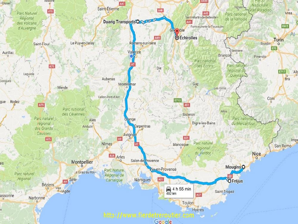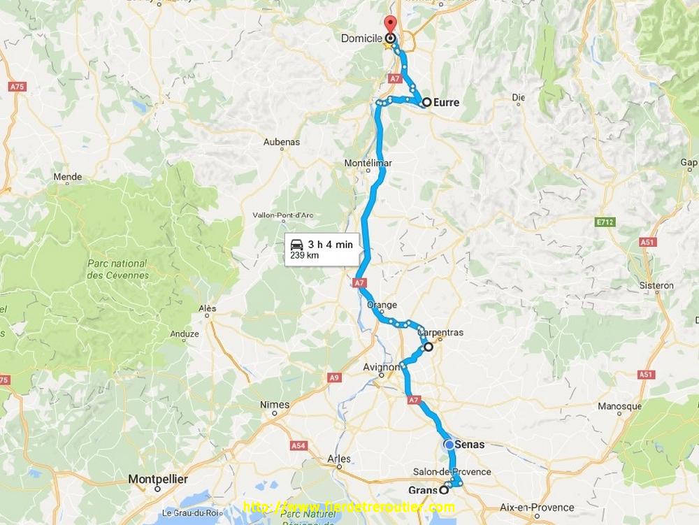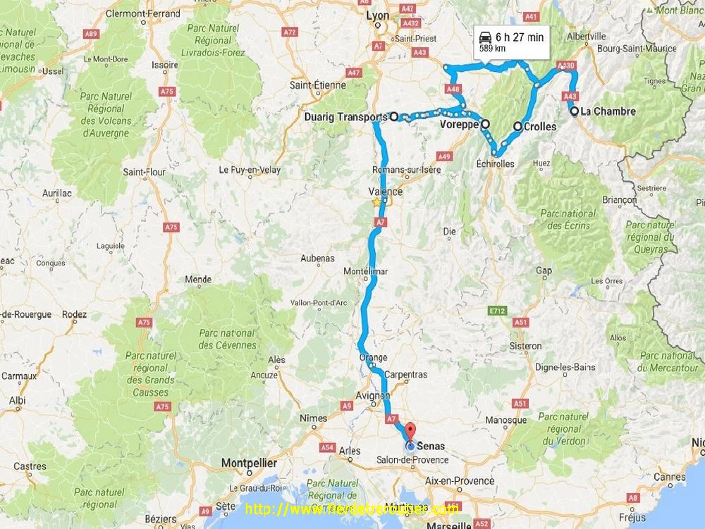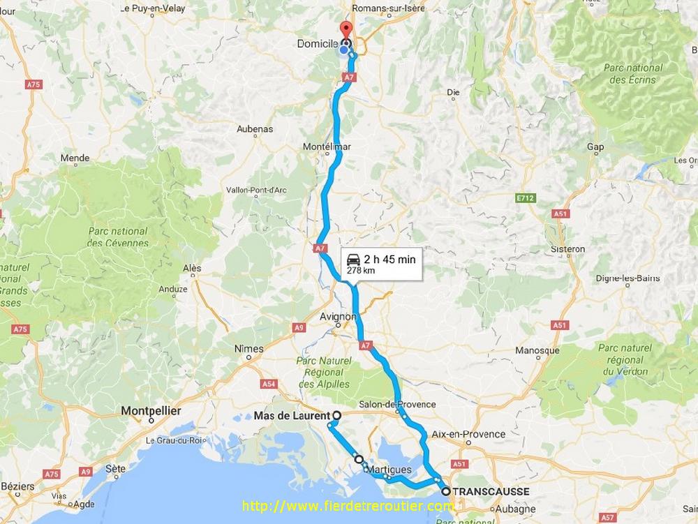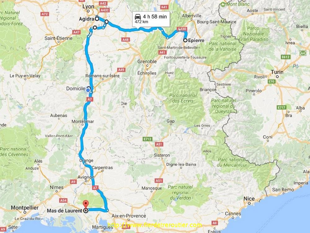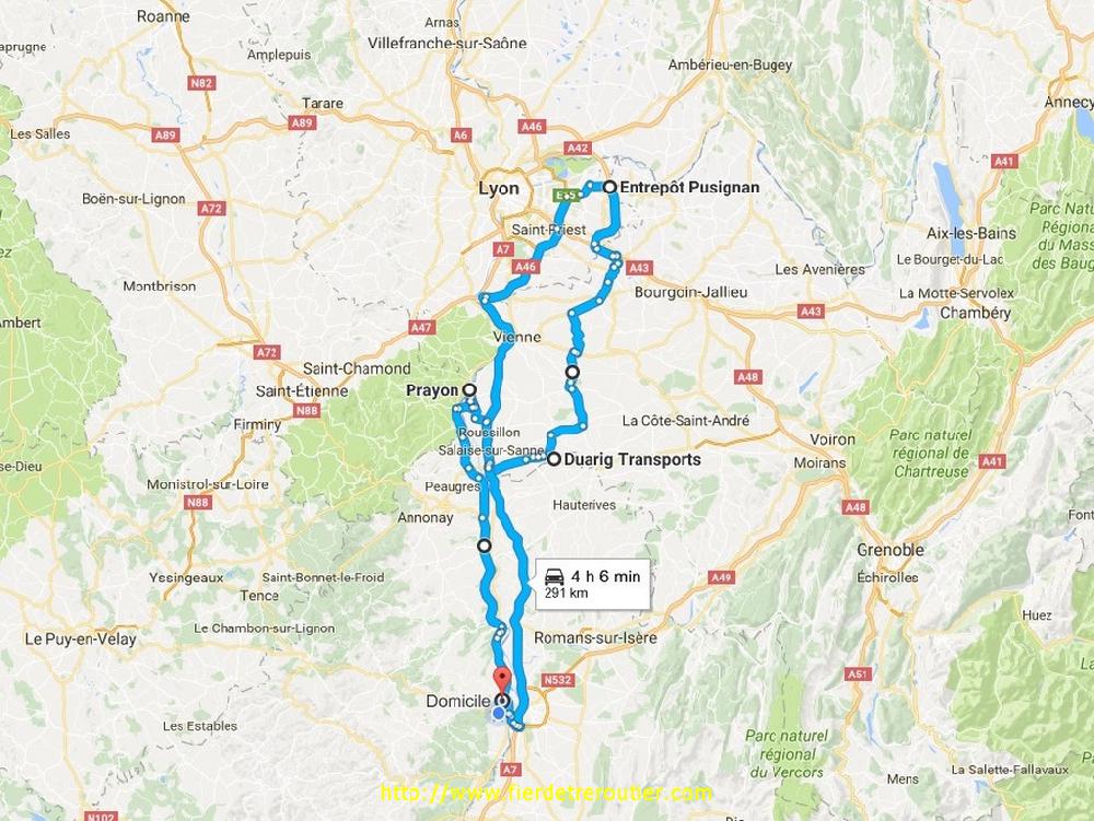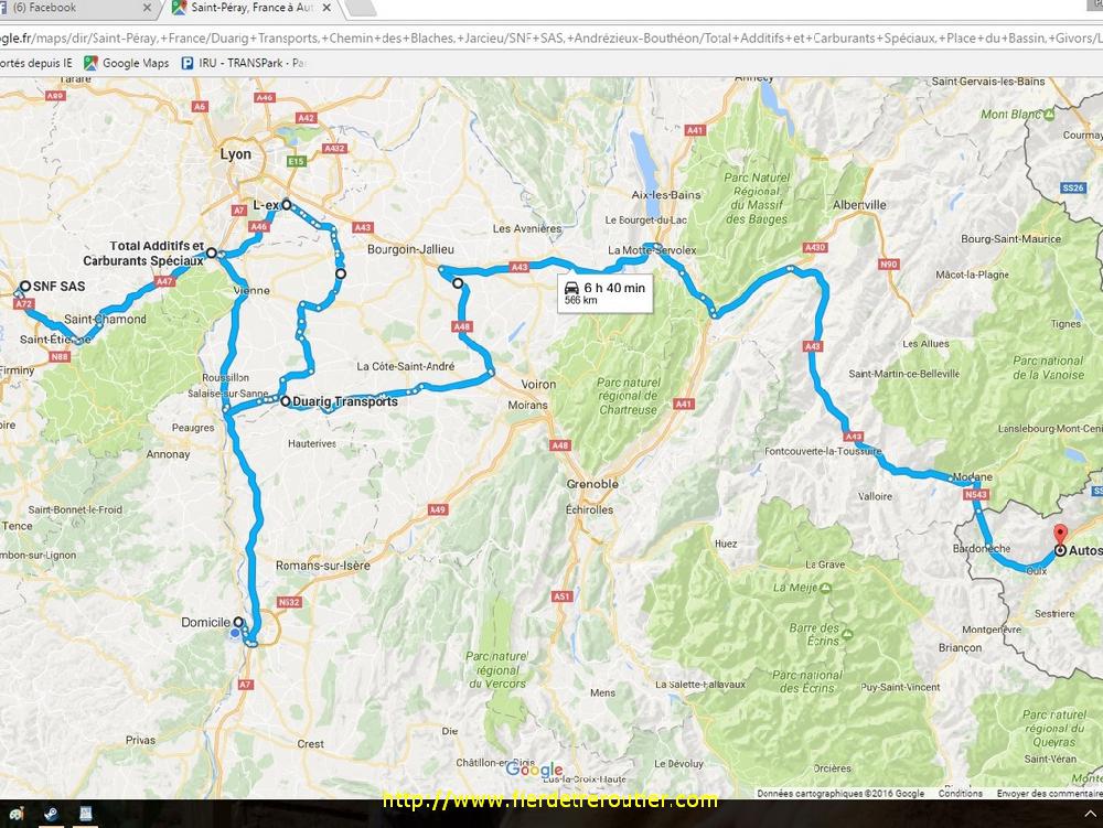 Finalement, je craignais le pire ici, mais ça a été, c'était pas aussi hard que je le craignais. Retour avec 2m62 de libre, direct dépôt. Google Map m'indique que c'est déjà tout rouge autour de Grenoble, je tire tout droit par Chambery, au dessus, c'est brouillard au programme, mais ça givre pas. Je repoe la taut pleine quai 5, et j'attrape sans discuter la sacoche de ma semi, je raccoche et go direction Eurre, ou on m'attends pour poser mes 2 plateaux à 19h30. J'ai plus qu'à descendre en roue libre direction Grans, je me pose au calme à Senas avec 8h52, il y en a bien assez pour un jour de paye !