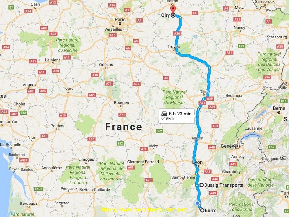 Donc, comme prévu, le chargement attaque à 9h à Eurre, un joli complet pour Epernay. Le soleil est de la partie mais il ne parvient que difficilement à rechauffeur la temerature encore bien basse pour un lundi. A 10h, je peux enfin aller me mettre au chaud dans la cabine de mon petit camion. Quand je reprends l'A7 à Valence il fait super beau, alors qu'etrangement l'Ardèche est encore noyée sous le bouillard, le bon dieu qui est loin d'être bête masque la vue de notre departement aux dromois pour qu'ils se sentent un peu moins mal lotis, mais si le bon dieu avait pû laisser vivre encore un peu Gotlib et lui preferer un autre comique, il y a du choix, entre Poutine, Trump et le reste, là, il aurait fait preuve de clairvoyance ! Je fais un crochet par le dépôt pour montrer que je suis toujours vivant, donner mes papiers et accessoirement mettre un peu de gasoil dont mon camion est extremement friant, je voulais aussi mettre un coup de lavage, mais il y avait du monde et j'avais moyennement envie d'attendre.