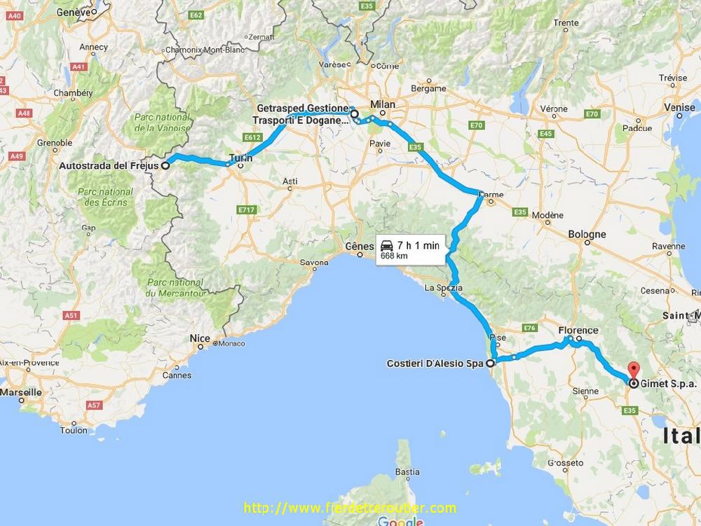Je ne traine que 30 minutes histoire de remettre les compteurs à 0, je suis annoncé pour 15h pas plus tard grand maxi 15h30 à Livorno. Alors je me jette tête baissée sur l'A1 jusqu'à Parme et ensuite direction La Spezia, c'est dommage qu'il fasse aussi moche parce que c'est une très jolie autoroute que je prends pas souvent, et sur le mouillé, il faut faire vraiment gaffe, ça chasse un peu à chaque passage de joint sur les ponts en courbe et il y en a un sacré paquet sur cette portion. Je finis par me radiner dans l'horrible zone portuaire de Livorno juste avant 15h, et vu la météo, c'est encore plus moche que d'habitude. En place au beau milieu des citernes d'hydrocarbures qui se demandent ce que je fous la... Ben je livre 3 IBC ! En 15 minutes c'est torché, et je tente sans convictions d'aller livrer Arezzo ce soir, mais il me reste encore 30 min de coupure à caser au milieu et de plus ça roule pire que mal sur Florence. Du coup je me radine à 18h10, la patronne ferme le portail, les caristes sont déjà partis depuis un moment, j'ai plus qu'à aller me poser avec mes 9h30 de guidon depuis ce matin, et en plus, je walide une bonne 11 !! Et il pleut encore....