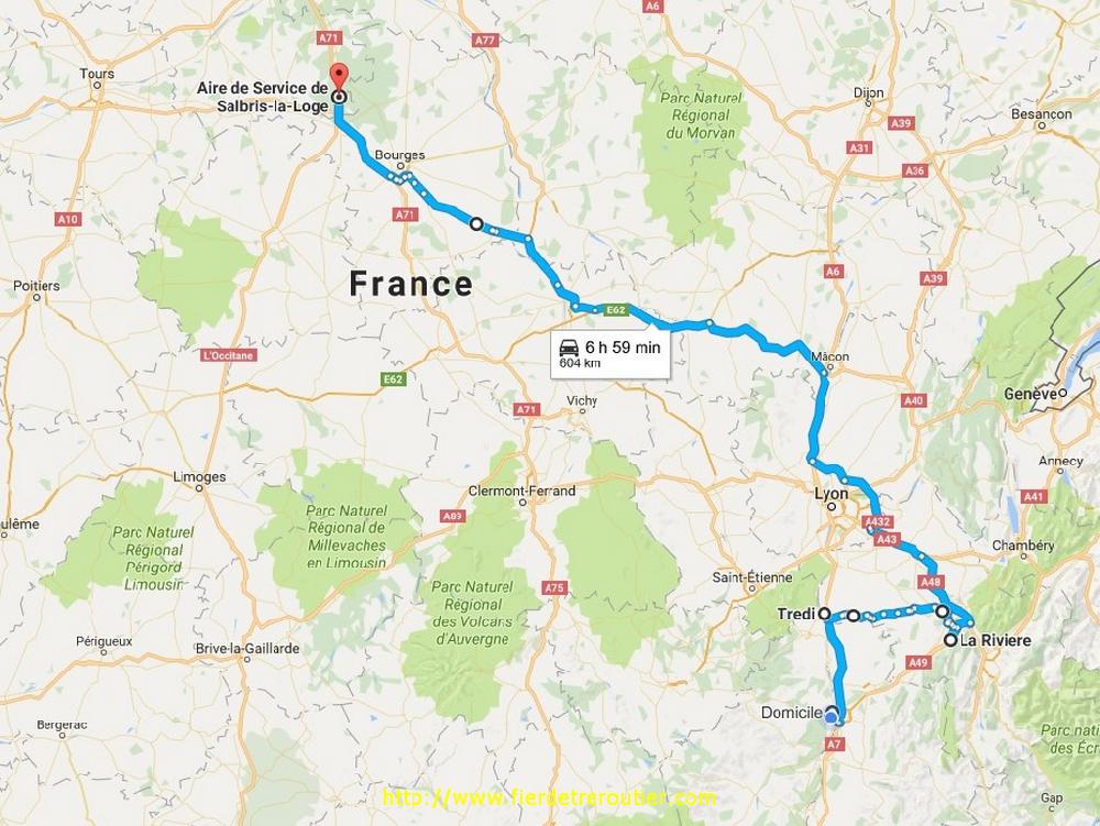 Je tente donc d'aller à mon rechargement sans grand espoir puisque je me radine à midi pile à Cournon, mais voilà, c'est mon jour de chance si je compare à hier, j'ai du charger à deux endoits differents dans la zone, mais à 13h c'était bouclé. Comme les vaches, je me suis garé le long de la voie SNCF et je ragardais passer les TER en broutant ma salade de tomates. Sachant qu'il ne me reste qu'une heure à rouler, je sais pas trop vers ou me parquer car ce soir je walide une 11 facile. Alors je suis sorti à Thiers pour recuperer la N89 et me poser sur le grand parking tranquille en principe à Noiretable, on est bien là Tintin !!