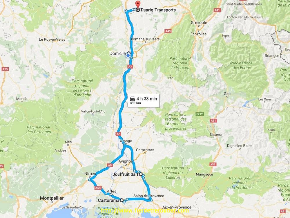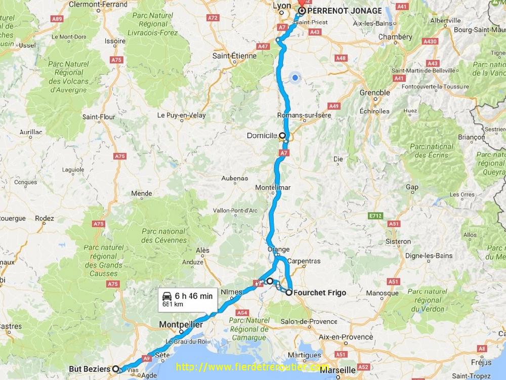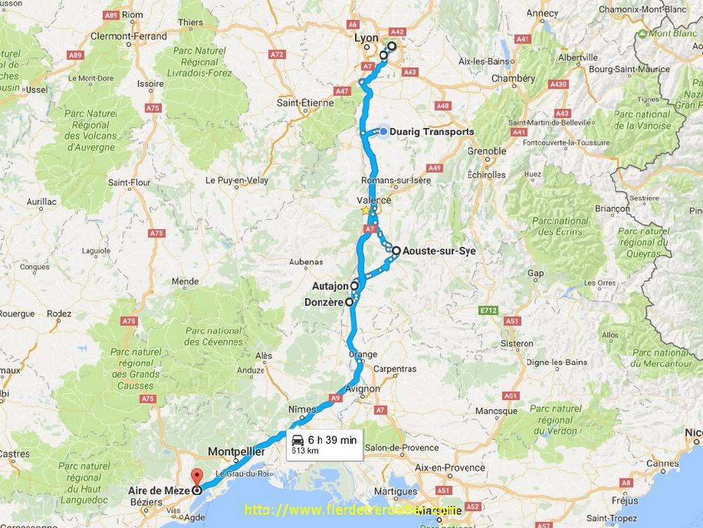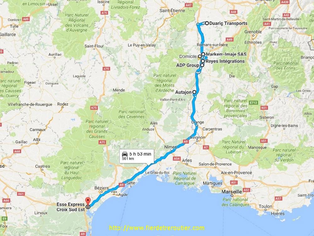 Dès le repris je me mets en place, il y a un Mistral d'enfer, limite insupportable on a l'impression qu'il fait -30° dehors, encore que, je ne sache pas vraiment ce que ça fait -30, je pense pas avoir été un jour confronté à ça, du moins pas encore. De là, je file à Montélimar ou c'est la reprise aussi, j'ai 3 clients à prendre pour Barcelone, et pour finir 4 palettes à prendre dans la vallée de la drôme à Aouste pour la GB. Bien qu'il reste encore la moitié de la semi je dois rentrer au dépôt, alors j'obéis, bien sage. Finalement, je vide tout, et pire que tout, je dois decrocher pour recuperer une taut déjà chargée pour la Catalogne. Je ronchonne pour la forme et je rends ma magnifique sacoche. Je balance un peu de gasoil, et je passe pour la 3e fois aujourd'hui au Grand boeuf, j'en peux plus de cette A7 ! C'est après Sète que je cloture ma journée avec 8h58 de guidon, oui, c'est quand même la classe, optimisation maximum ! Gros coup de bol surtout !