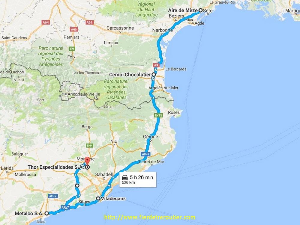 Ce coup-ci la semi est archi full, j'ai plus qu'à aller faire des montagnes russes, je cale le bouzin à 80 et je me reveille de la sieste tout au bout du C25 ou il y a un virage de la "muerte que mata" ou de la mort qui tue pour les analphabètes que vous n'êtes pas. Je me pose à Pia pour casser la croute en ecoutant le journal de France Inter au calme, enfin, au calme c'est vite dit quand même, parce que ce batard de vent est de retour et il m'avait franchement pas manqué. Le seul avantage c'est que ça me fait un bon brushing en sortant de la douche narbonnaise. Cette saleté de vent va reduire à néant tous mes incroyables efforts pour réaliser une conso correcte sur la remontée, c'est comme ça, je peux pas lutter contre les éléments, faut que je me fasse une raison, vais je m'en remettre, franchement je me demande ! Quoi qu'il en soit j'arrive au terme de cette harassante journée de labeur vers 20h30 au dépôt, la coupure sera bonne, et oui !