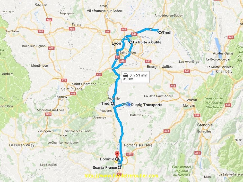 ....Sauf qu'il y a une palette chargée par erreur, et que bien sûr la palette est au bout de la semi et qu'il faut tout ressortir et tout recharger, bon, c'est pas grave c'est le début de l'année faut pas stresser. Finalement je suis prêt à 14h30 et j'enquille pour une pénible remontée il y a beaucoup de vacanciers, et ceux qui étaient cons en 2016 au volant n'ont pas pris de bonnes resolutions, à 17h30 je suis en place chez Fourchet à Jonage, ça vide rapidos, et j'ai plus qu'à aller me mettre en place à 2 pas d'ici à Meyzieu pour faire un passionant transfert demain. L'avantage c'est que ce soir je fais une bonne nuit garé au calme chez le client, y en a besoin !