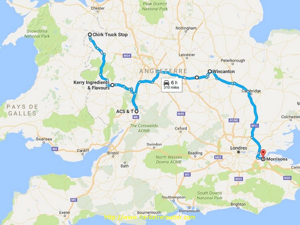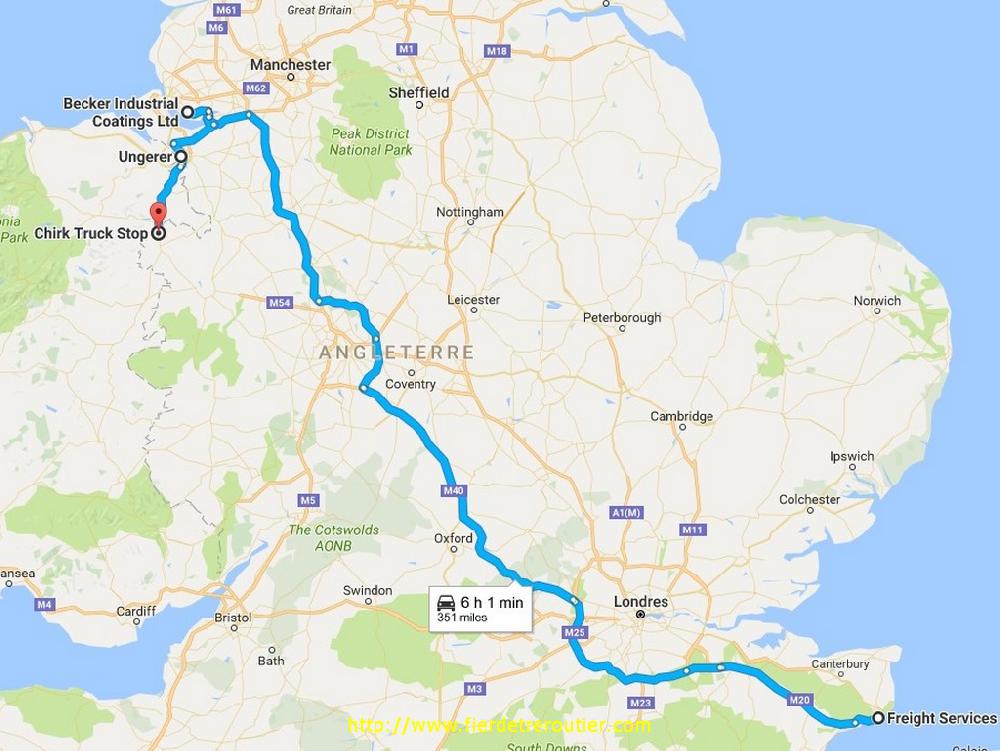 Le complet est vidé en moins de 40 minutes, impec, ça me laisse le temps de checker l'itineraire à prendre pour la ramasse suivant à Chester, le temps s'est brusquement changé, il pleut avec du vent froid, c'est très agréable pour rouler, mais en un peu moins d'heure je suis en place, accès facile, marchandise prête, papiers prêts, whaow ! keskispass ??? Ah bé oui, c'est l'heure de fermer la boutique ! J'attends dehors quand même pour la suite du programme, j'ai 1 palette à prendre un peu plus au sud à Tenbury Wells, mais ça sera pour demain, je m'approche péniblement avec les bouchons du soir, et j'ai 8h30 de guidon et 12h30 d'amplitude quand je tombe sur un truckstop juste avant Ostwestry, je ne tente pas le diable d'autant qu'il y a de la place ! Bonne journée finalement !