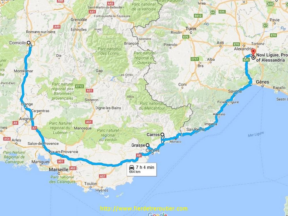 Après avoir donc livré ma matière à Grasse, je file poser les deux dernières palettes de la journée à Carros, client facile, rue facile, et le gars est super sympa il me propose même le café pour me rechauffer et me remercier d'avoir prevenu et tiré mes deux palettes, c'est un americain en fait, et le type a du savoir vivre, tout s'explique... Je me gare un peu plus loin, et vu que c'est midi j'en profite pour caser la croute. J'ai plus qu'à ensuite passer la frontière et aller au bout de mes 9h. Bien que je sois passé des dizaines et des dizaines de fois ici c'est toujours aussi magique, par contre il y a une chiée de travaux avec basculement de chaussée j'ai pas gagné du temps, à un moment donné 3 bagnoles m'ont doublé in extremis avant un retressissement justement et se collaient bien, si bien que le premier à loupé le basculement, tout planté et tout le monde s'est rentré dedans, les prix nobels se sont pas fait mal, mais ils auraient mieux fait de me suivre. Après Genova, l'autoroute est aussi salée qu'un chips, ils y vont pas avec le dos de la cuiller... Je termine mes heures à Novi Ligure, j'ai pas eu de quoi aller jusqu'à Tortona et finalement c'est aussi bien pour mon compte en banque ! Ce soir c'est la fête, je valide ma 1ere 11 ! 16h40 fin du lundi !