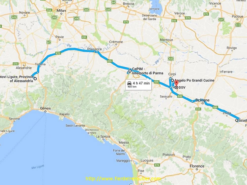 A 7h je me décide à decoller de Novi Ligure, j'ose pas dire que j'ai froid vu qu'il fait -1 ici et qu'ailleurs on depasse les -10, bref c'est l'hiver. Le parking s'est bien vidé et ça roule déjà pas mal quand je recupère l'A21 direction Piacenza. Je me cale bien à 85, parce que j'ai lu ici et là que les carabiniers font de plus en plus la chasse à ceux qui roulent un trop au dessus et je suis pas enclin ces derniers temps à lacher des € pour rien. La traversée de Piacenza est interdite de doubler aux PL et limitée à 80, devant moi depuis un moment je me tenais à distance d'un plateau ridelle, le quel s'est mis à 65 sur toute la traversée de Piacenza, derrière moi il y avait une sacrée colonne de camions, le type était vide et je le soupçonne d'avoir fait largement exprès, d'autant qu'après de retour sur l'A1 direction Bologne il s'est mis à accelerer comme un malade, y a des cons des fois et ce de partout. Quoi qu'il en soit je deboule à 9h à l'Interport de Parme, client plus que facile et rapide, en 30 minutes c'est vide.