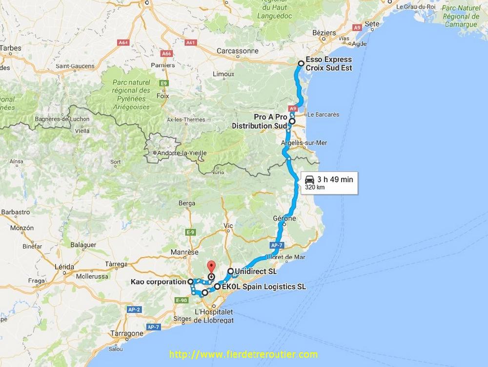 Le plan grand froid est activé ce matin en Catalogne, il fait pas loin de -2°, on fait face là à des temperatures extremes, il faut être serieusement motivé pour sortir travailler, double ration de blouson ! A 8h30 je decolle pour aller charger, non, j'ai pas encore une fois trainé au lit, c'est juste que la boite ouvre pas avant. La commande et les papiers sont prêts, le personnel toujours sympathique, et le quai presque facile ! Non, vraiment c'est le top de charger ici. Quand je demarre avec mes 24 IBC à 9h27, j'ai un complement de 2m de plancher à Vic, ça tombe bien, il me reste 1m20 ! Donc me voilà sur les magnifiques routes Catalanes plongées