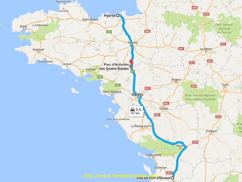 Ici tout est automatisé, c'est assez impressionant, mais c'est quand même des humains qui chargent, les palettes sont gerbées à mort et sont fort gerbantes. Je vois defiler toutes marques Intermarché, Odysée, Monique Ranou tout ça, y a de quoi bouffer pour plusieurs régiments. Le chauffeur à côté me demande si j'ai déjà été aux saucisses ? Non, bien sûr, il m'a dit que depuis il en bouffait plus, j'ose pas imaginer la fabrique des patés. De toutes façons, c'est tous ces plats préparés qui nous rendent tous malades et obèses ! Au total, je repars de là avec 17T et la bagatelle de 90 palettes. Heureusement c'est pas des Europ. La seule chose que j'avais pas prévue c'est que j'ai RDV entre 1h30 et 3h à Avermes, fuck, ça arrange pas mes affaires je vais être rik et rak en amplitude du coup.