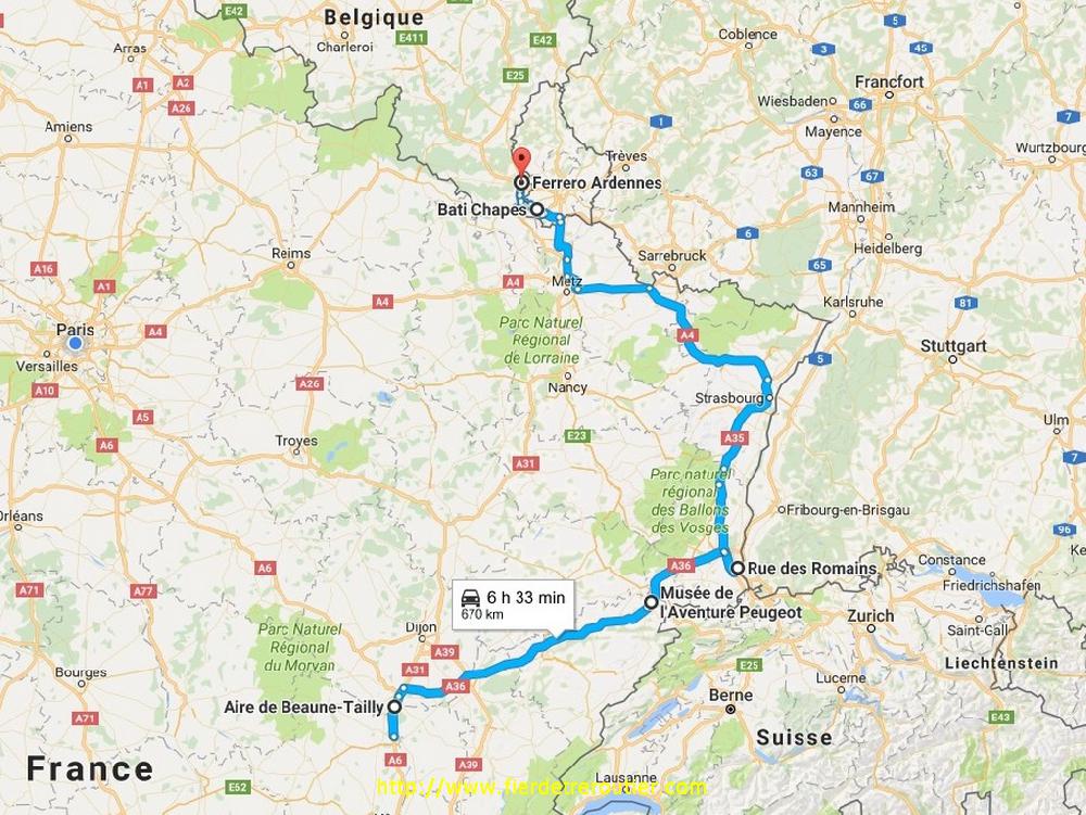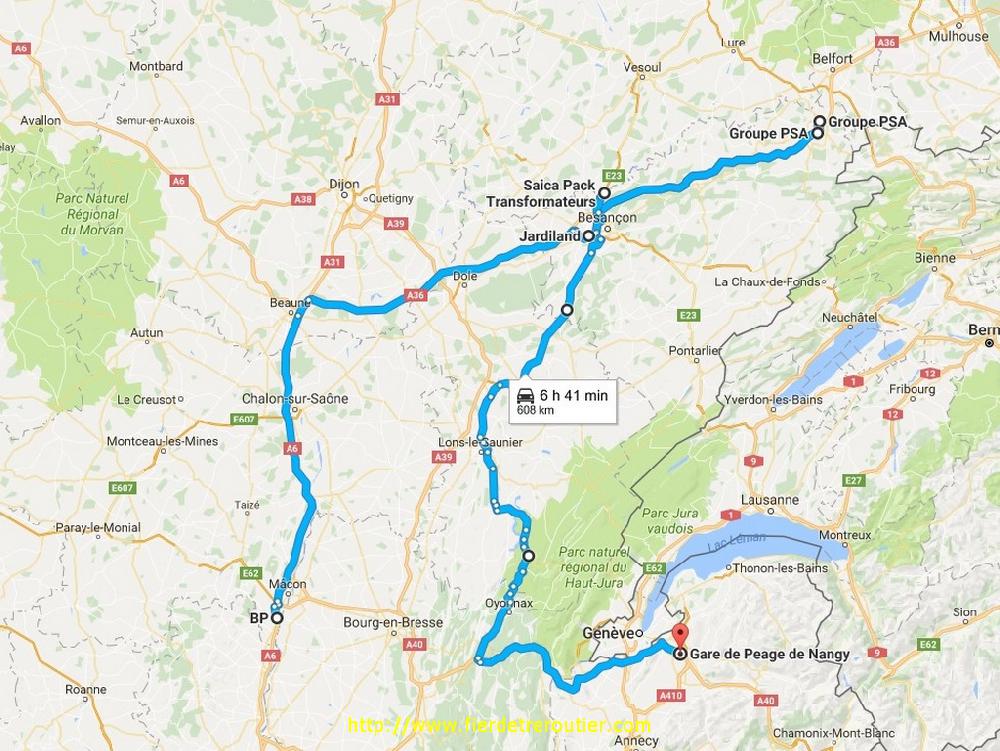 C'est ensuite avec un joli soleil que je vais livrer le centre d'essai à Voujeaucourt, je sais jamais ecrire du premier coup ce nom de bled. Arrivé là à 11h30 j'y croyais pas trop car entre la procedure d'entrée et le mik mak qu'il faut faire pour rentrer la dedans... Mais non, un chef est venu m'escorter jusqu'au parc à fûts le long de la piste d'essais, à midi et demi c'était bouclé et j'avais plus qu'à aller me caler à l'ombre pour becter. J'ai pas fait un repas de noces non plus hein !? 5 km plu sloin il y a Peaugeot Sochaux, et j'ai été poser mes 3 dernières palettes, ça a été ultra rapide si je compare à la derniere fois ou j'ai tourné en rond ni peu ni assez avant de trouver le bon guichet.