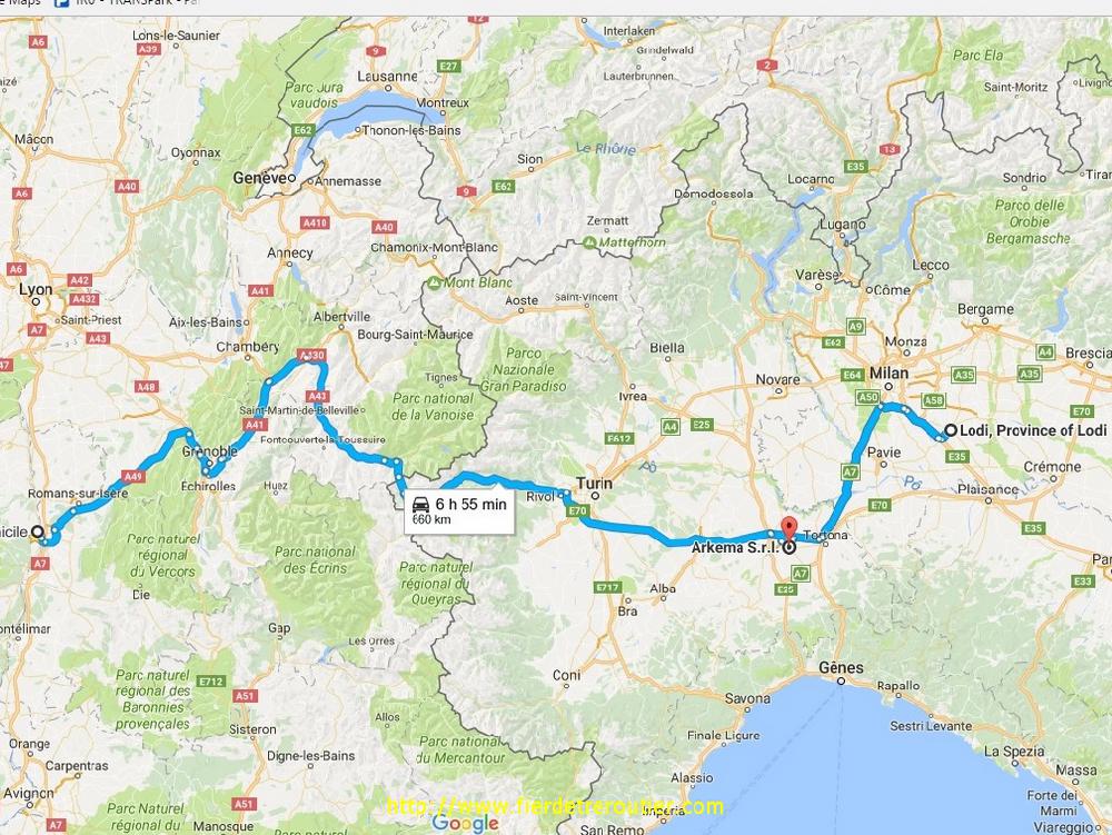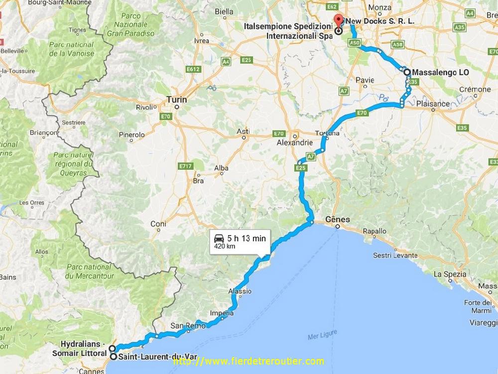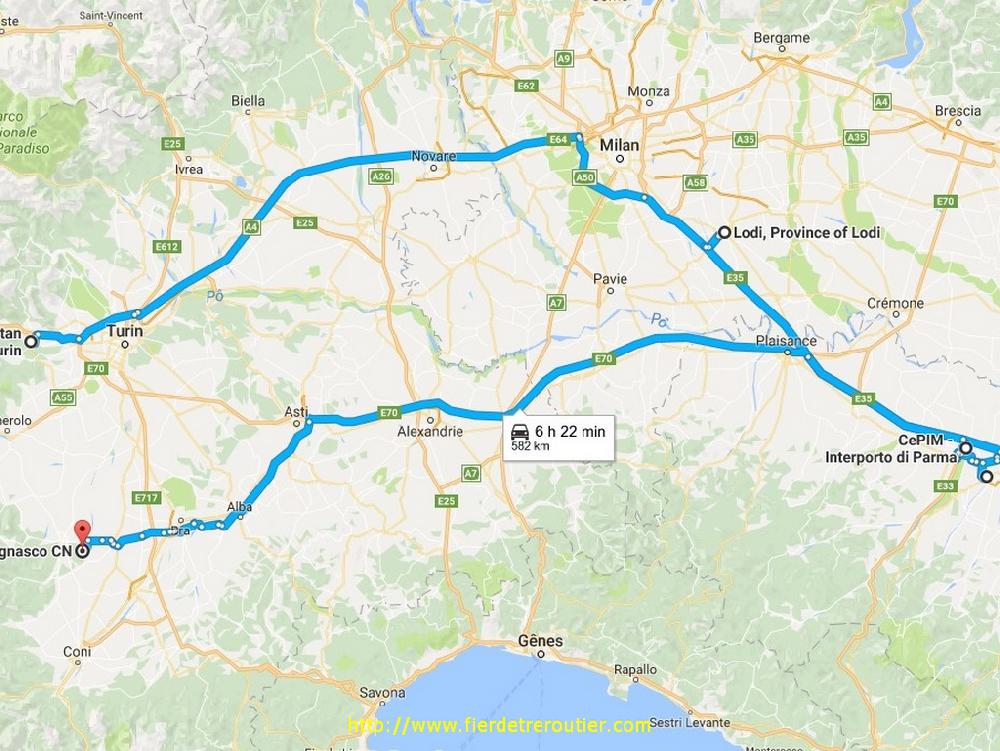 L'heure de pointe est passée, je sors tranquillement de la magnifique région Niçoise, ou je suis resté bien sage dans la traversée parce que ça m'a déjà couté 90€ il y a 15 jours. De plus je suis encore en ADR et j'ai pas envie de me faire reperer plus que ça. Arrêt doccia à Vintimille sur les chapeaux de roue. Ensuite ça roule assez bien malgré les innombrables zones de chantier de l'autoroute des fleurs, par contre pour le soleil ça sera pas ça puisqu'il se met à pleuvasser après Albenga, je m'arrête enfin casser la graine une fois tous les emmerdements potentiels passés bien après Le Turchino. Je traine pas trop quand même, ça serait balot d'être parti dimanche soir pour rien, sorti à Castelsangiovanni je me demande quand même si j'ai pas fait une connerie, il y a un pont sur le Pô interdit aux + de 10T pour travaux, mais j'ai rien compris, j'ai vu les flics en train d'aligner juste avant, mais j'ai croisé un Italien dans l'autre sens aussi alors MYSTERE et boules de Mozzarella. Quoi qu'il en soit je me radine un peu avant 16h chez le client à Massalengo, ça ferme à 17h, OUF.