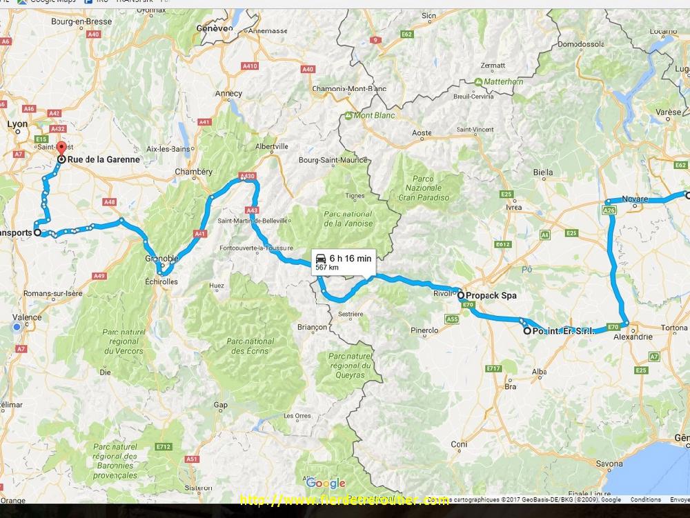 Je suis dégouté parce que j'ai pas pû regarder la 250e rediffusion des bronzés font du ski hier à la téloche, et oui, pour partir à 3h, je règle le reveil à 1h45, ça fait tôt. Ici on sent quand même que l'hiver a pris sa claque, il ne gèle pas c'est vraiment cool, et ce qui est encore plus cool c'est que ça roule nickel pour sortir de St Peray. Ce matin, contrairement à 99% des matins, je ne pars ni vers le nord, ni vers le sud mais vers l'est, du moins la vallée de l'Isère et Grenoble ou même à 4h du matin, il y a des grumeaux de chez grumeaux, mais ça ne bouchonne pas encore. Ensuite c'est calme plat mis à part les troupeaux d'Italiens que je croise, en 3h pile je suis à la plateforme du fréjus, je passe juste avant le convoi ADR qui se met en place. A Oulx, je me paye une sièste de 52 minutes, ROYAL ! Plus je m'approche de Turin, plus ça roule, mais heureusement, la plupart prennent direction Milano, pour moi c'est de l'autre côté et ça bouchonne pas. Il y a du brouillard ce matin, on se croirait presque dans la plaine du Pô. Il est 9h30 quand je finis par me radiner à Spinetta Marengo ou je dois charger 2 palettes ADR.