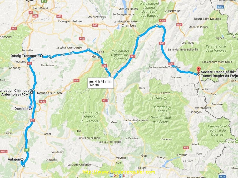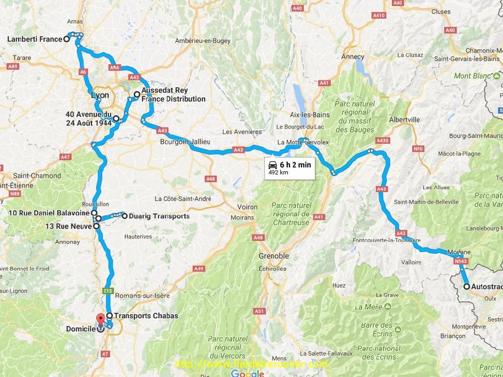 Finalement, je devais livrer avant 14h à Ste helene du lac, c'est donc bien mort et c'était de toutes façons courru d'avance. Je livre directement à l'usine à Chambery. Je fais juste 30 minutes de coupure, c'est interdit de rouler après 16h ici. Il faut prendre aucun risque ! Quand je chope l'A32 après Turin, il y a plus grand monde ce coup-ci, il m'arrive même d'avoir de l'horizon et ça fait un bien fou ! Avec 13T le FH grimpe la rampe comme qui rigole, lui aussi il est tout fou cet apreme !!!! Finalement, je me radine à 17h30 chez Alpina, un gars des bureaux m'attendait, je l'ai aidé à vider, en 10 minutes c'était fait. Le pire c'est que le gars nous rend service, mais en plus il m'a filé un carton de pâtes, incroyable ! Il a bien vu aussi que son client nous a un peu tronché hier. Retour ensuite à Jarcieu, j'ai pile poil les heures, mais y a rien qui va depasser, j'y arrive avec 9h46 au compteur, ouf !!! Ensuite je passe du mode 44T/2,60m*4m*16m au mode 400kg/1m3 en rentrant avec la SMART, on a une Smart toute neuve, j'avais même pas vu, 2000km au compteur, à 21h je suis à la maison, en mode je me repose. Je suis le 1er humain que ma femme voit cette semaine.